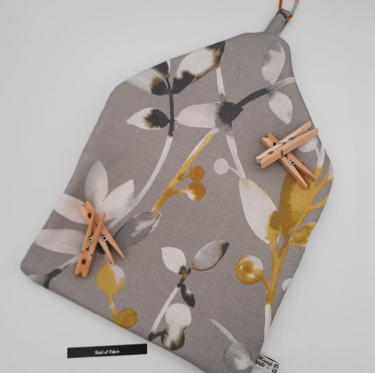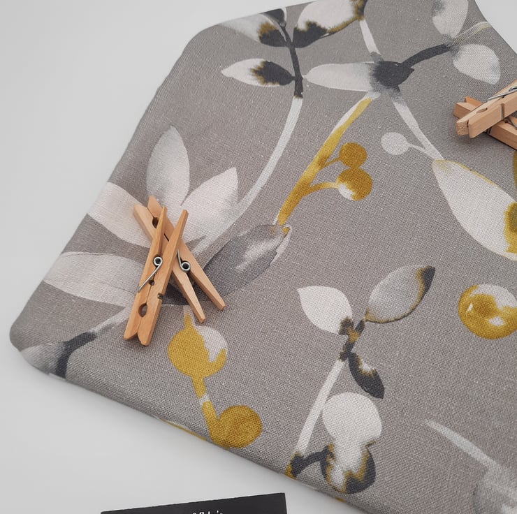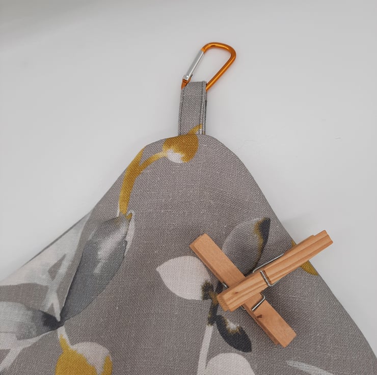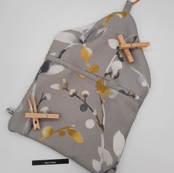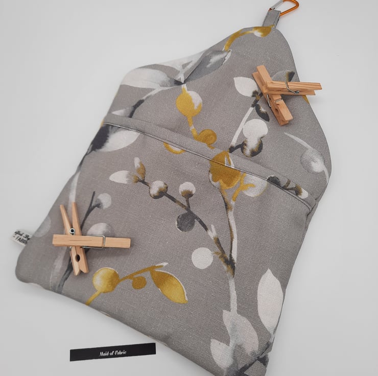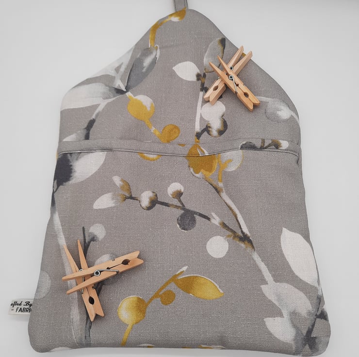 Peg bag made using a grey, white and yellow linen fabric. Lined with a cream cotton fabric.