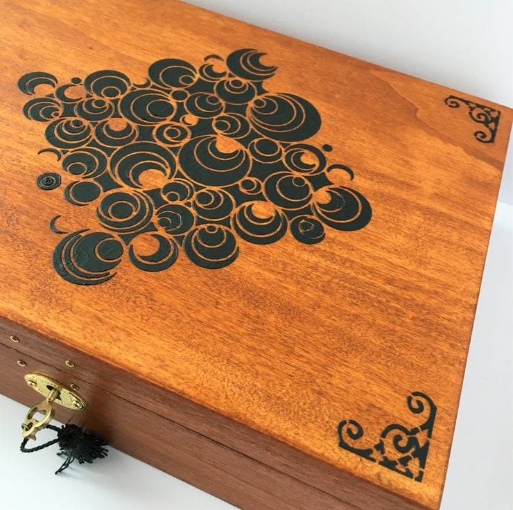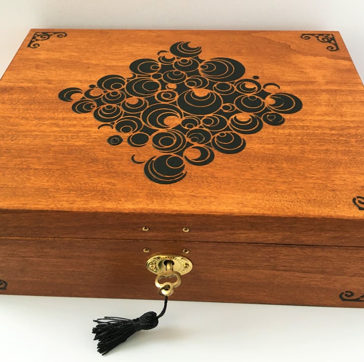 LOCKABLE Wooden Rosewood Box. Geometric Pattern & 6 dividers by Livz Design