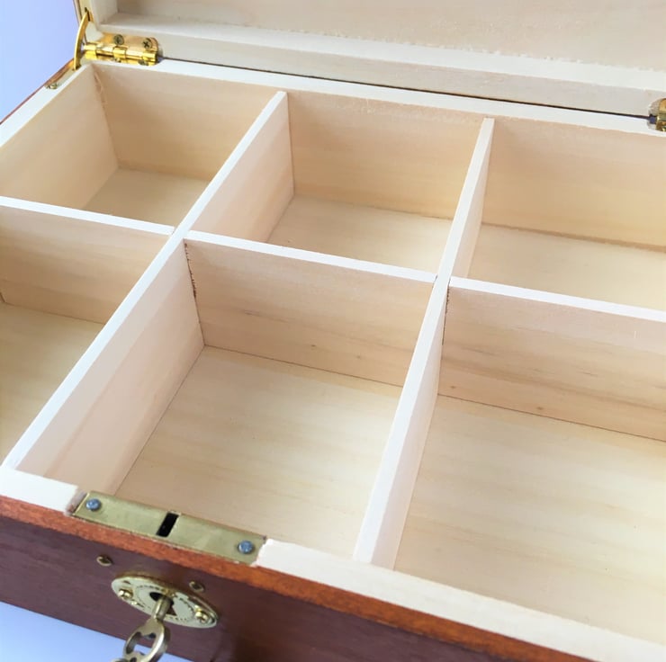 It has 6 internal dividers, brass coloured hinges and mortise lock with key.