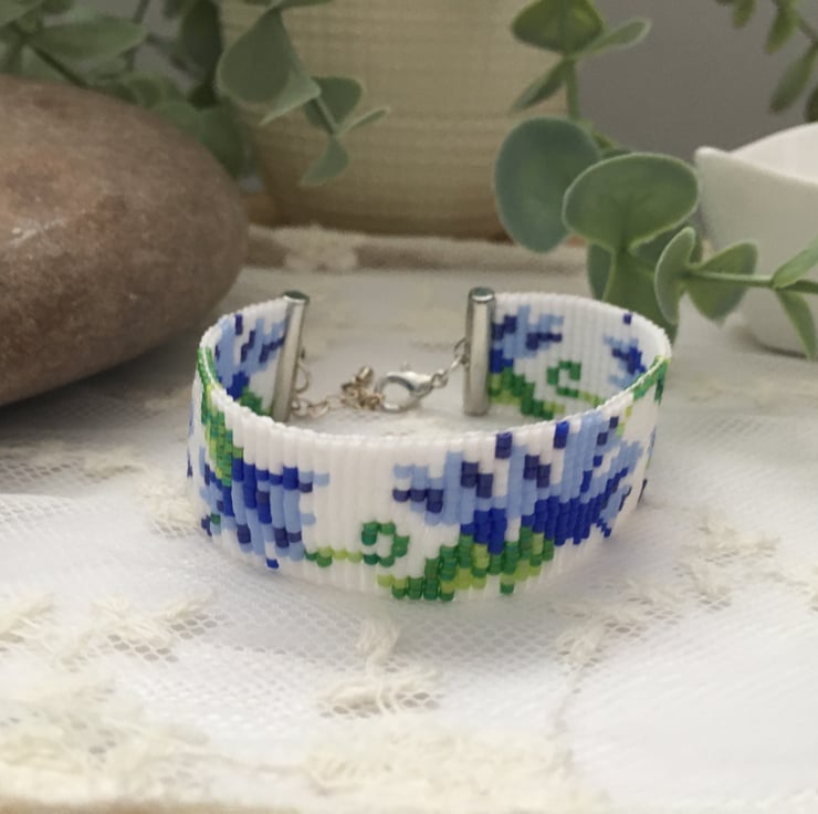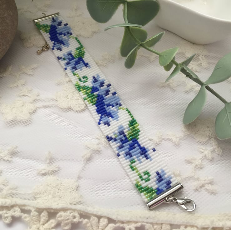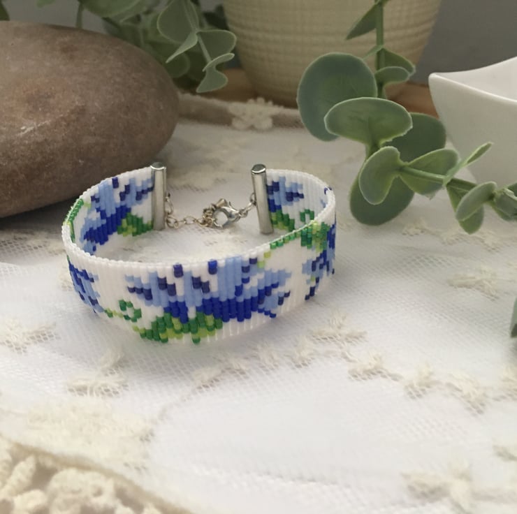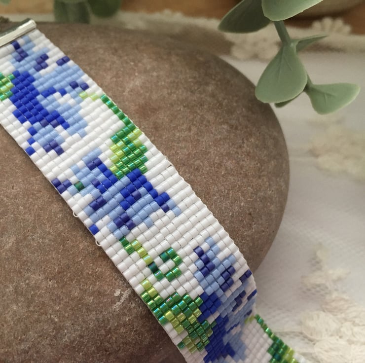 Created on a beading loom using tiny glass Miyuki delica size 11 seed beads to form a pretty Blue Cornflower design this bracelet is very tactile and easy to wear. Completed with an extender chain to be adaptable to most wrist sizes.