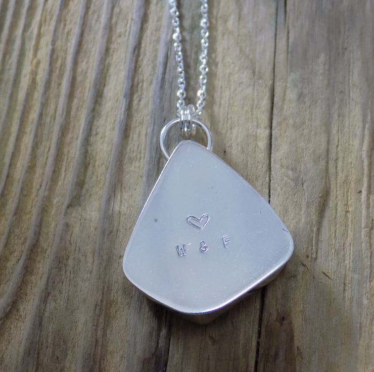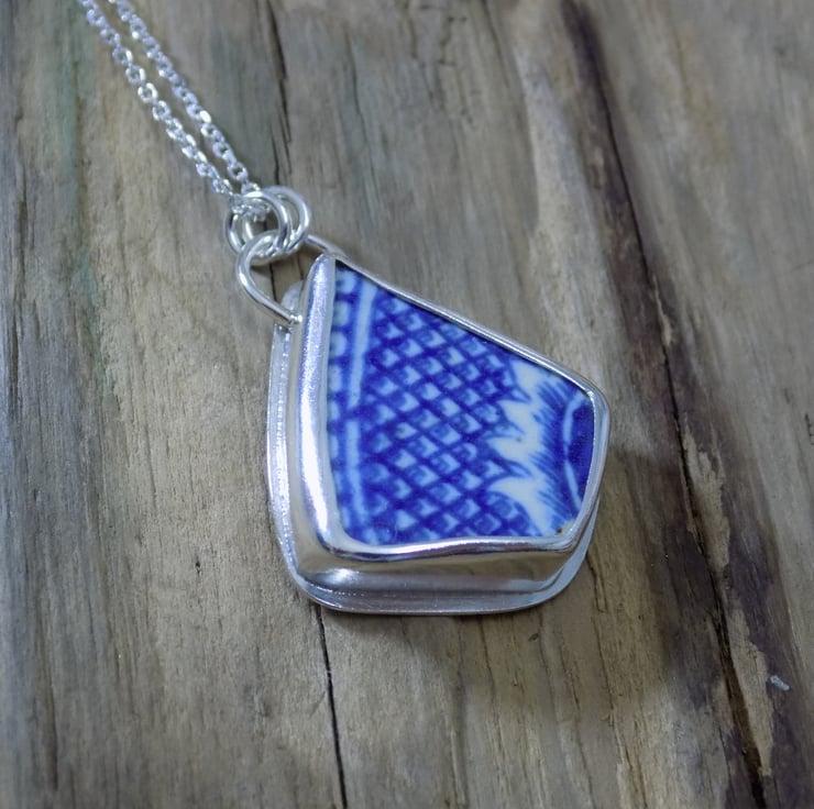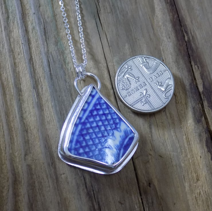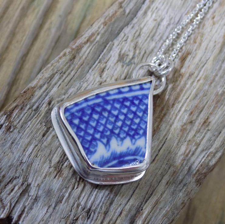 A pretty piece of pottery collected from the Thames foreshore has been set in a custom made bezel using traditional silversmithing techniques. A sturdy bail has been soldered on and has two jump rings from which an 18" diamond cut trace chain hangs.