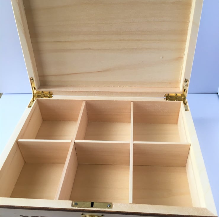 Beautiful one of a kind aged lockable wooden storage box with 6 internal storage sections.