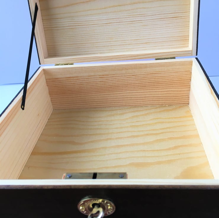 Finished with corner on-lays, brass key plate and a small oval plaque that you can have engraved by your local engraver or jeweller.