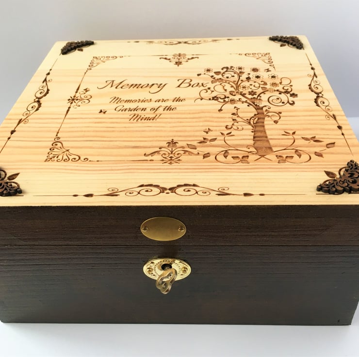 This is a Unique engraved wooden memory box in an Aged Walnut stain and natural wood.