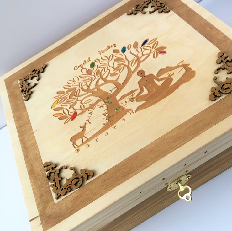 Engraved and stained Tree of Life lockable box for storing crystal, healing crystals, gems, stones, runes and other precious items.
