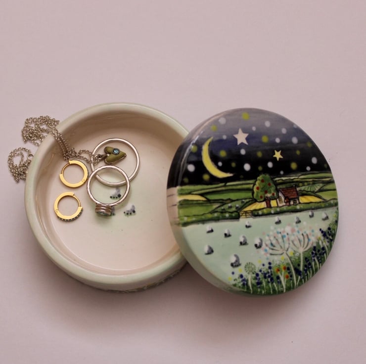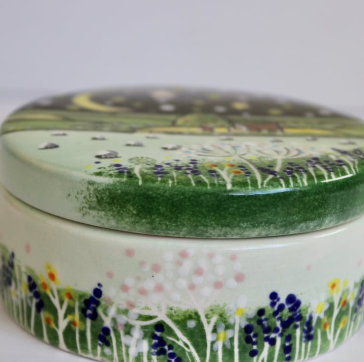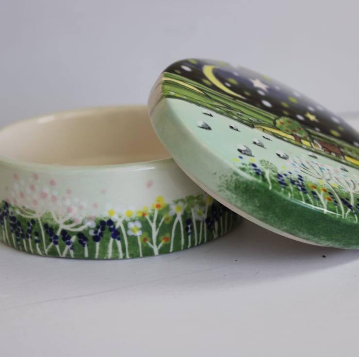 I hand paint glaze with a starry night country scene. A little cottage nestled amongst rolling hills full of sheep, cows and wild flowers makes the sweetest gift. I even paint a little sheep in the base.