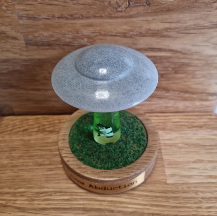 UFO and beam made from Resin, (beam in Forget me Not Blue) Daisy is or should I say was made from plastic. The base is made from solid Oak with a flickering LED light in the base.