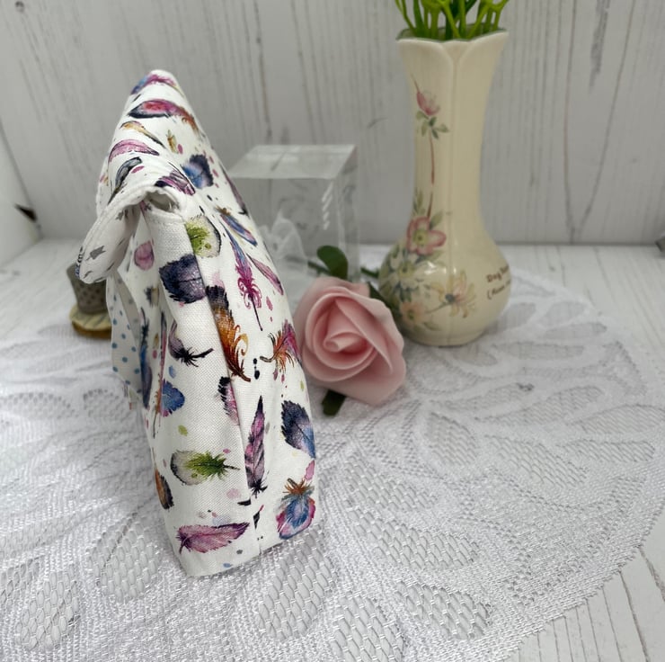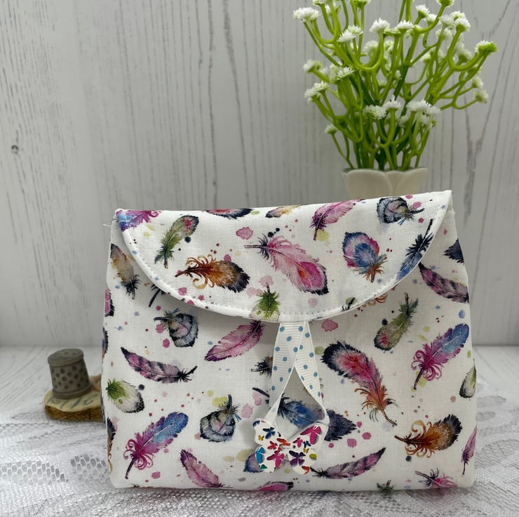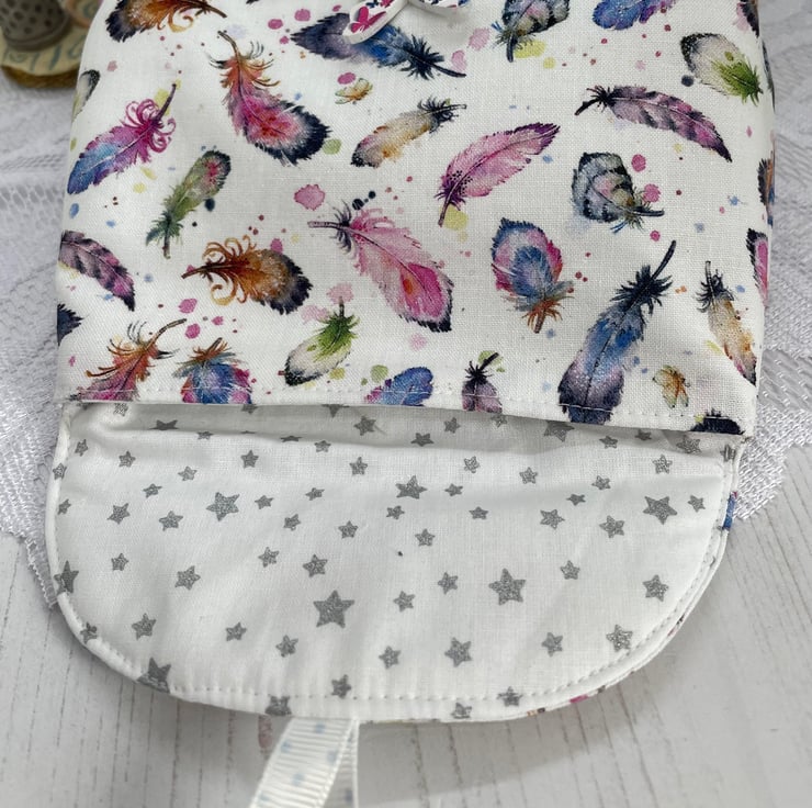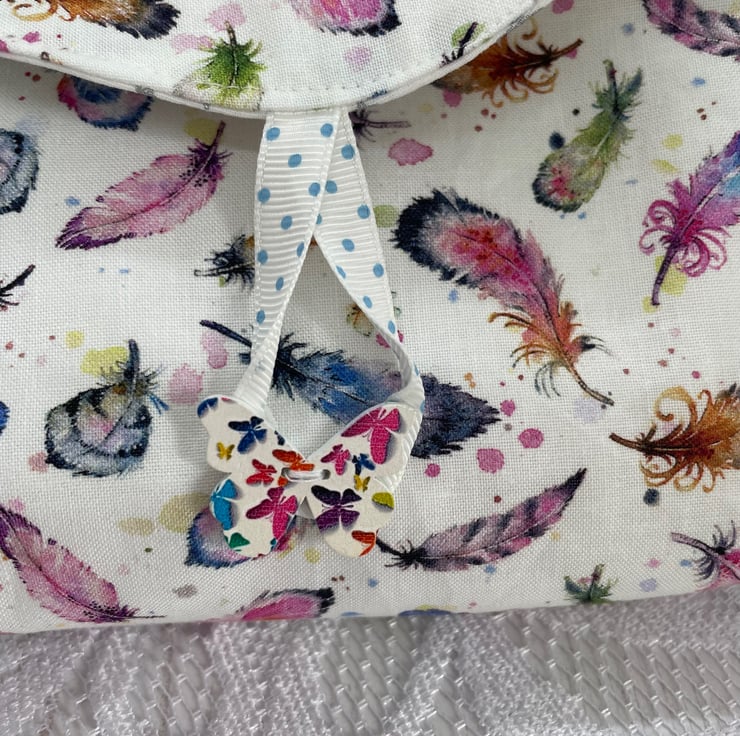 Feather print cotton fabric. Lined with a silver star on white cotton fabric. Large butterfly wood button to secure shut with polka dot loop.