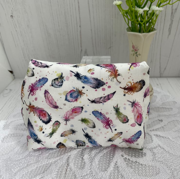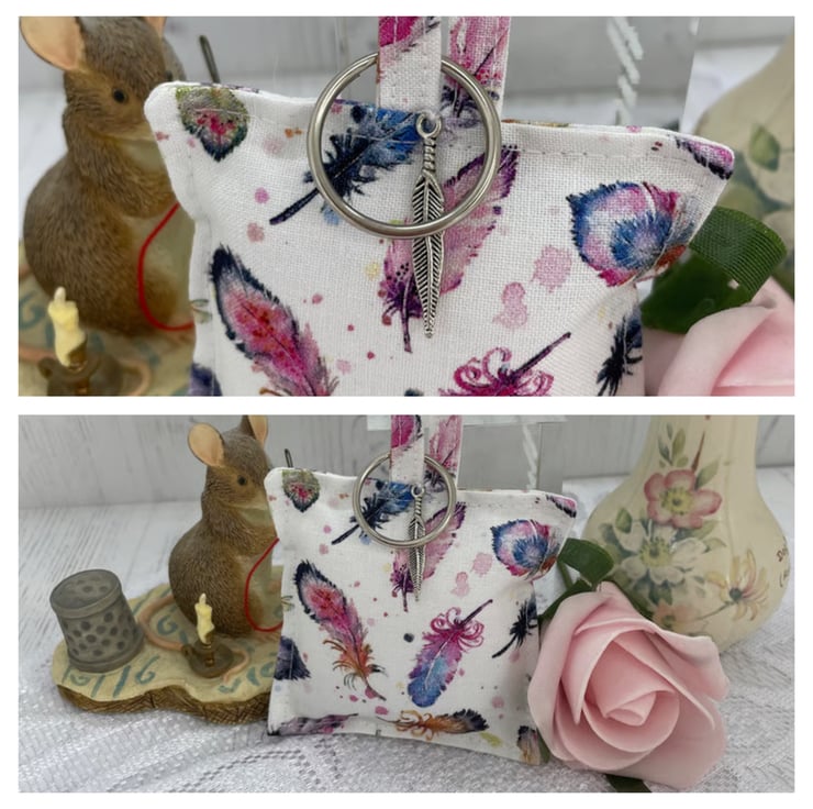 Mini cushion style key ring, made from feather print cotton. Silver tone jump ring for your keys and a feather charm. Lightly filled with poly fibrefill.
