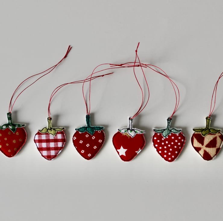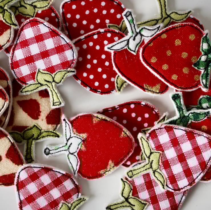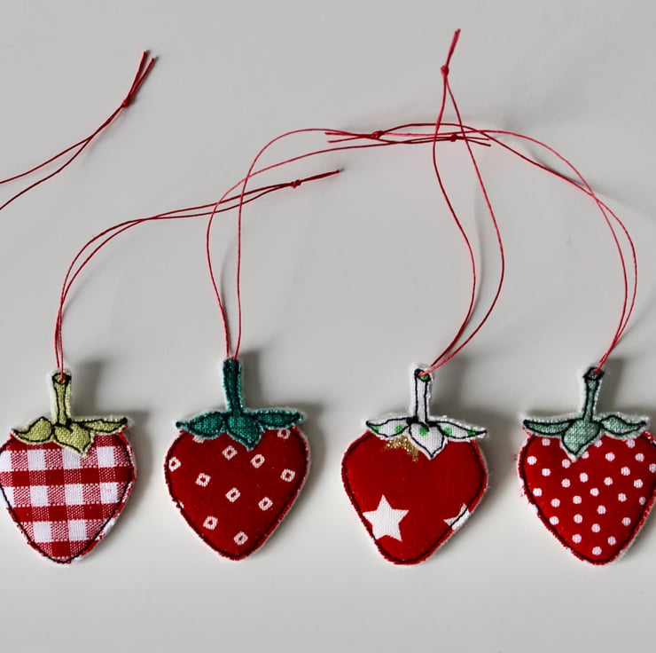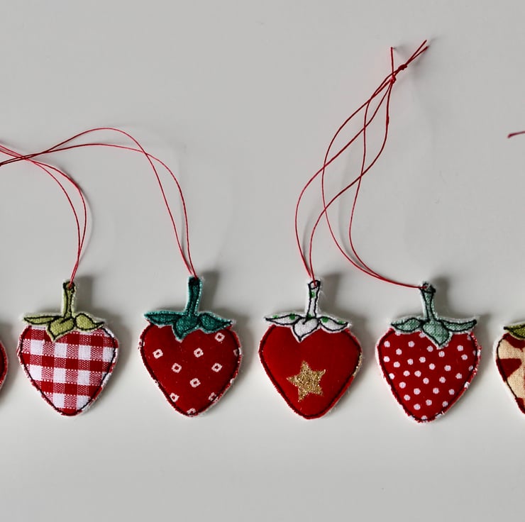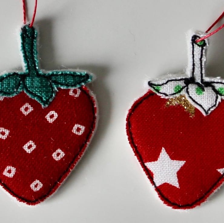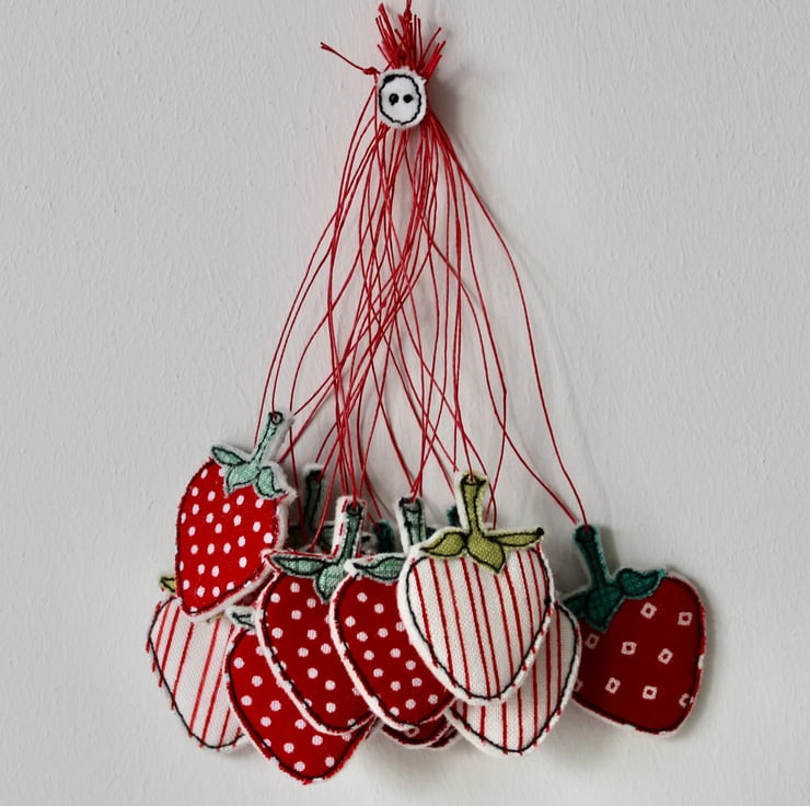 Each strawberry is created using multiple layers of cloth, sewn using freehand machine embroidery and then cut out by hand. There is a linen thread to hang.