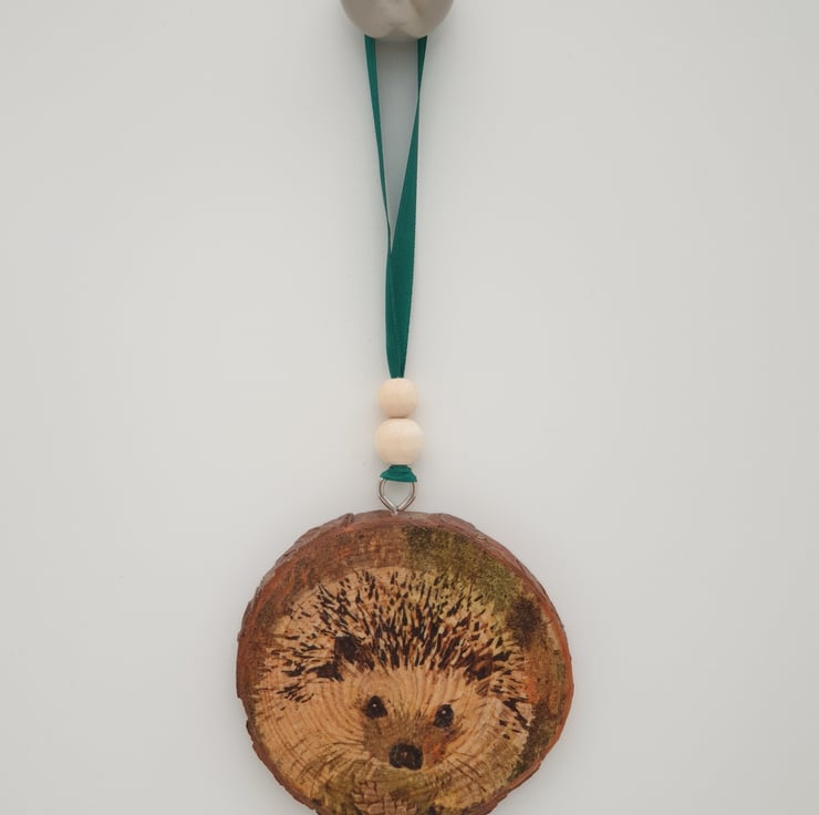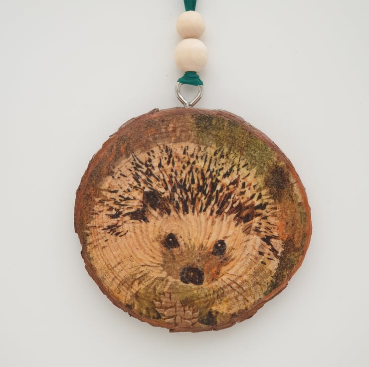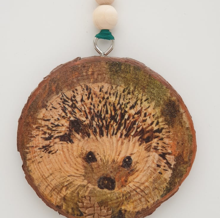 Sweet hedgehog hanging wood slice decoration which would make a lovely gift for a nature lover. The wood slice has been decoupaged with the hedgehog design and then had several layers of satin varnish applied for protection. A metal loop has been screwed into the top with 2 wooden beads and green satin ribbon ready to hang. This lovely hedgehog would look great hung in a window, from a door handle, knob or shelf, etc. Will be supplied in an organza bag finished with ribbon making the perfect gift for a birthday, thank you, teacher, friend, etc.