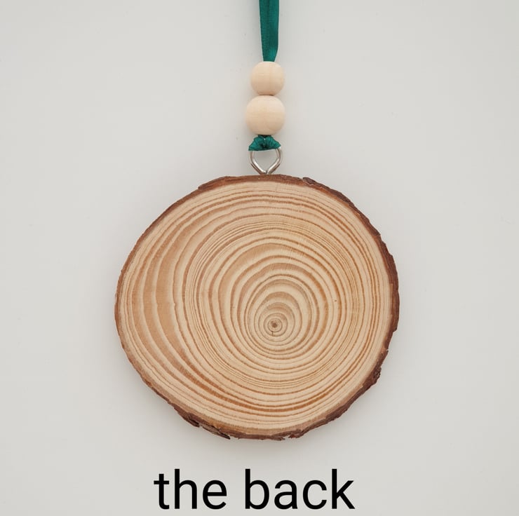Size of wood slice without metal loop and ribbon: 8.5 cm diameter x 1 cm depth approx