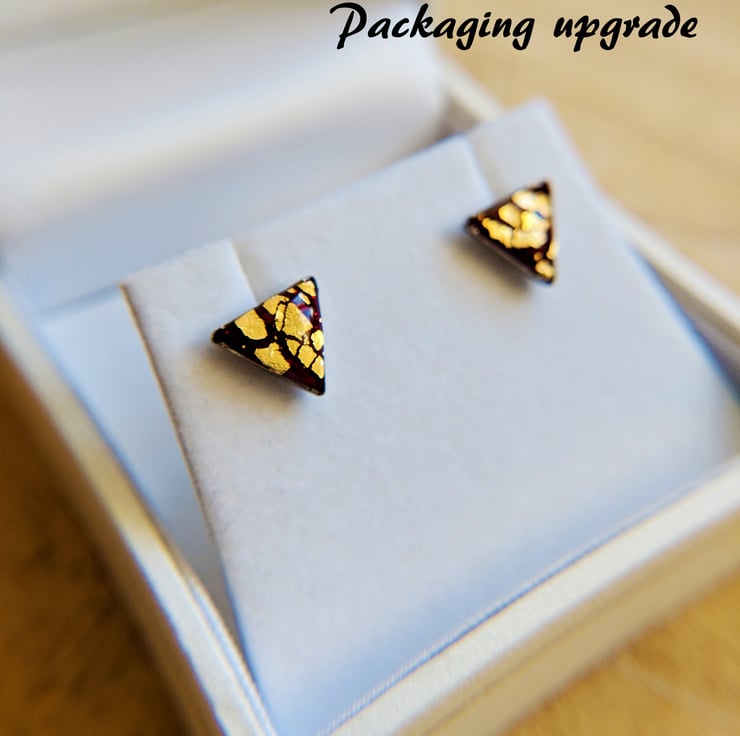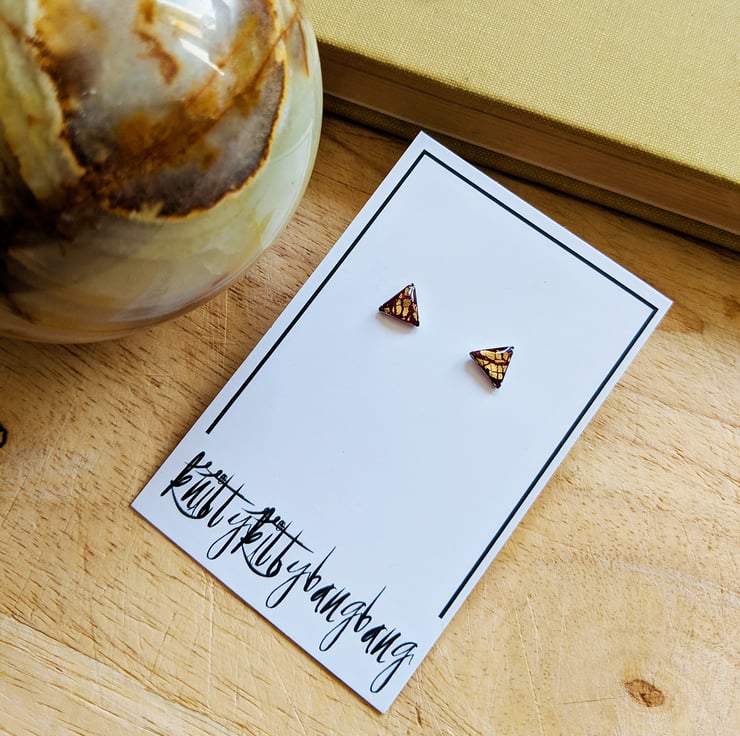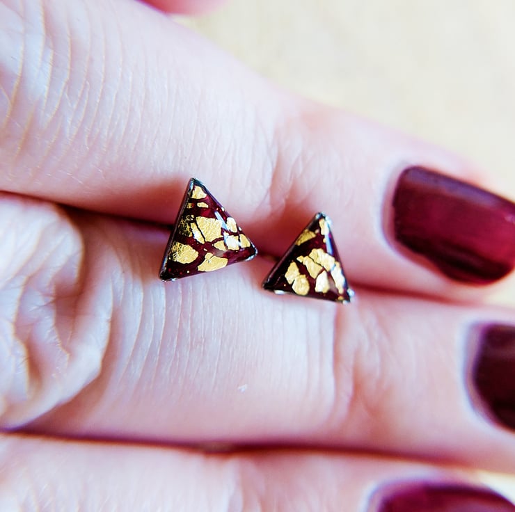 Rich burgundy gold crackle effect triangle earring studs in stainless steel setting.