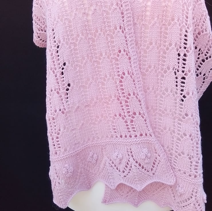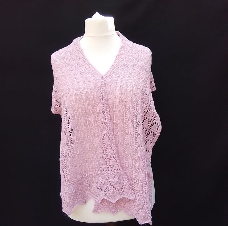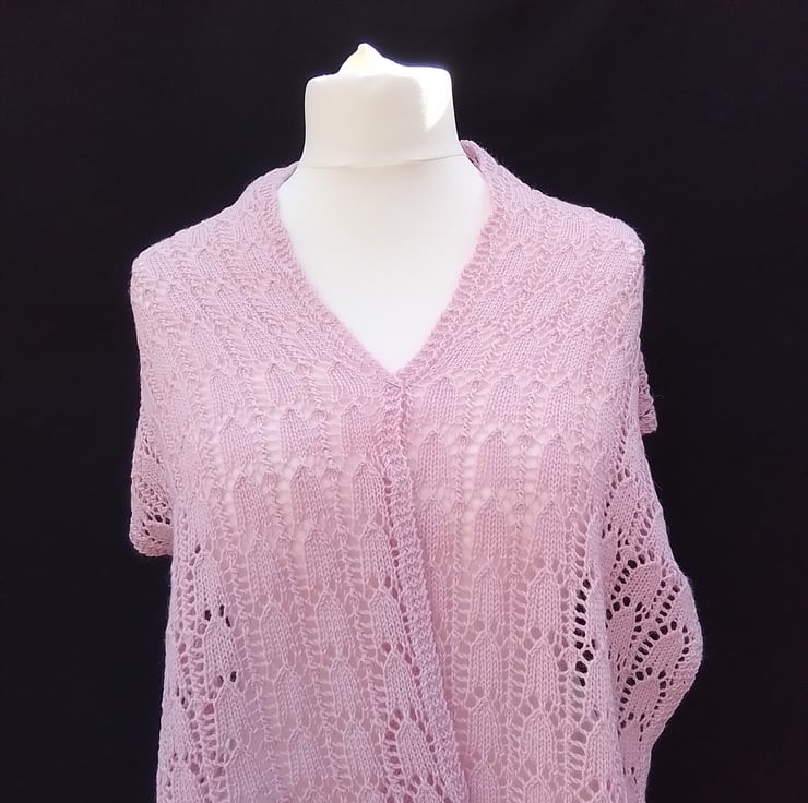Ladies' Lacy Shawl or Wrap, delicately hand-knitted in a soft light pink hue using a blend of luxurious alpaca and wool mixed yarn.