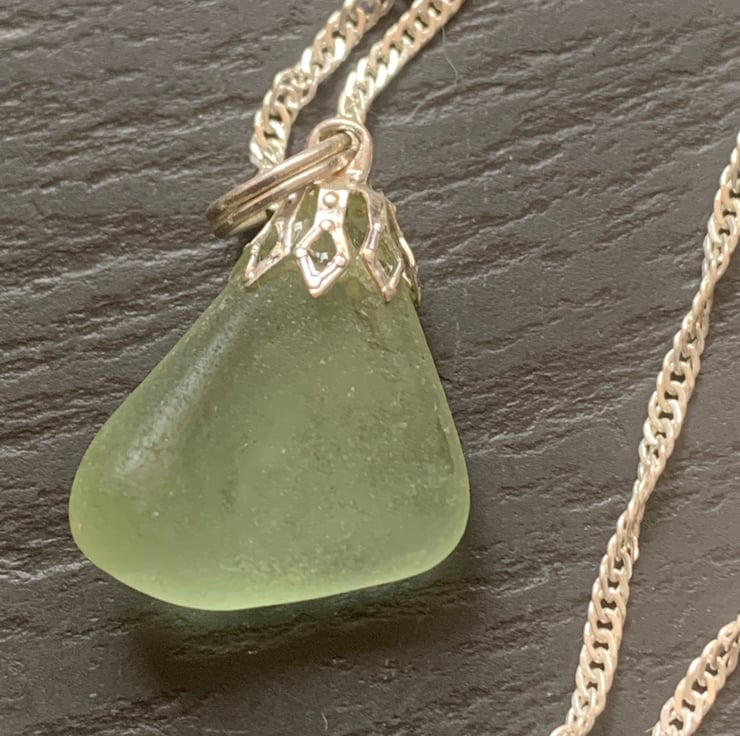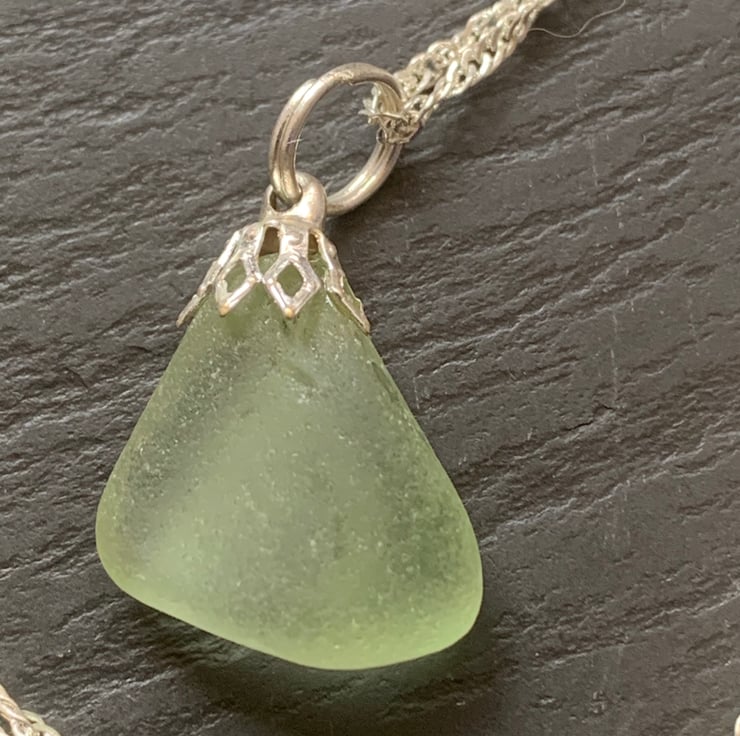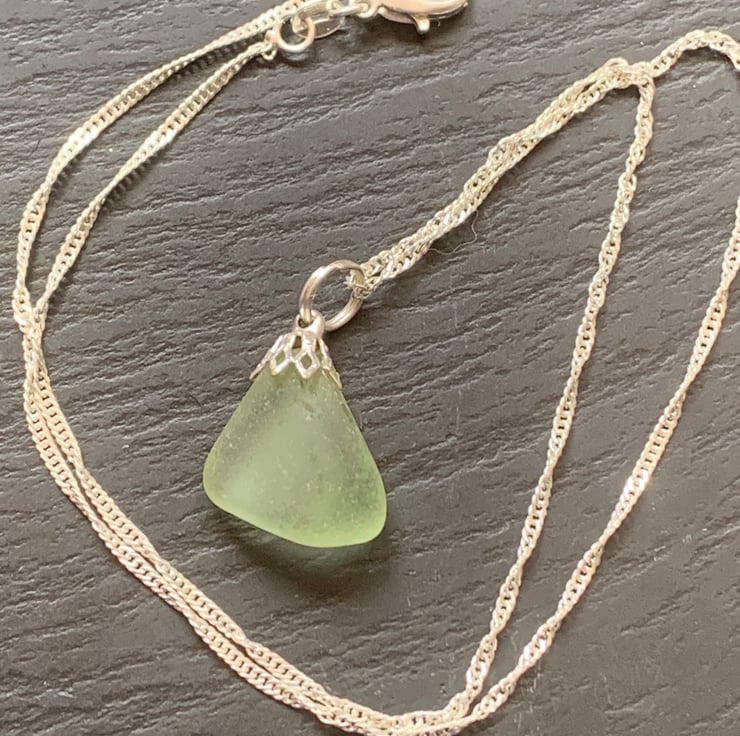 This petite lime-green piece of seaglass was collected from Withernsea beach. It is approximately triangular in shape, 2x1.5x1.5cm and 0.5cm at the thickest and affixed to a silver plate bail with a 18inch silver plate twisted chain. Lime-green is one of the more unusual seaglass colours.