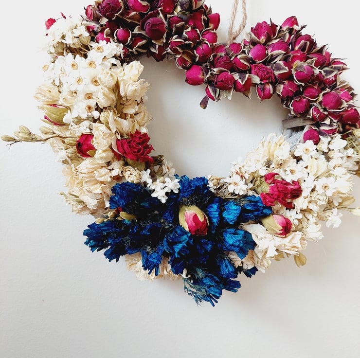 A beautiful handcrafted dried flower arrangement on a 15cm rattan heart wreath before the flowers are added. 20cm with flowers.