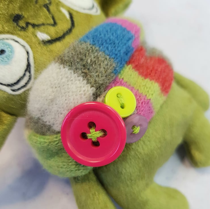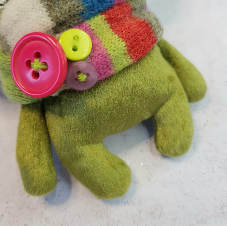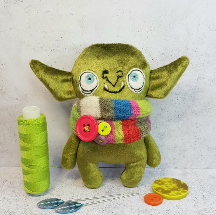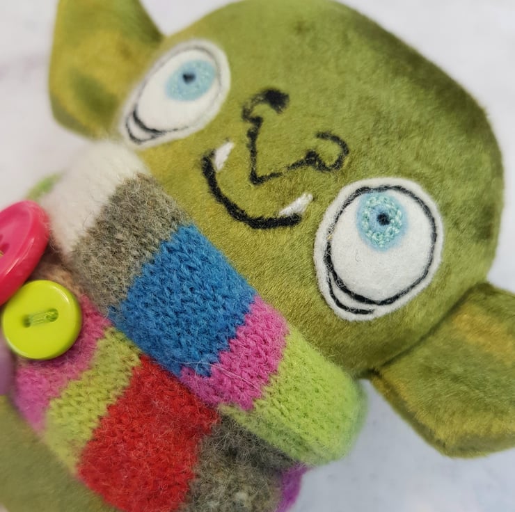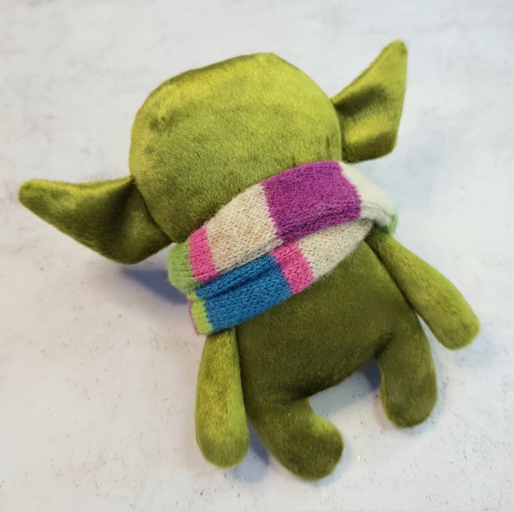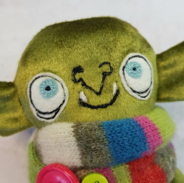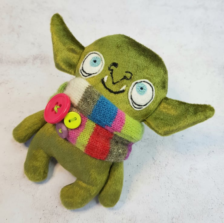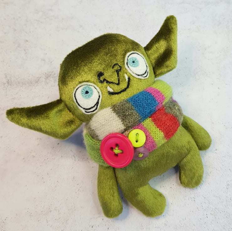 Velvety green goblin art doll with upcycled wool blend scarf. This goblin has free motion embroidered felt eyes and measures roughly 11cm tall with an 11cm earspan. The goblin is firmly stuffed and the scarf features mismatched buttons. This goblin is designed and created by myself. This goblin is not a toy and meant for decorative purposes only. Sent in recyclable packaging.