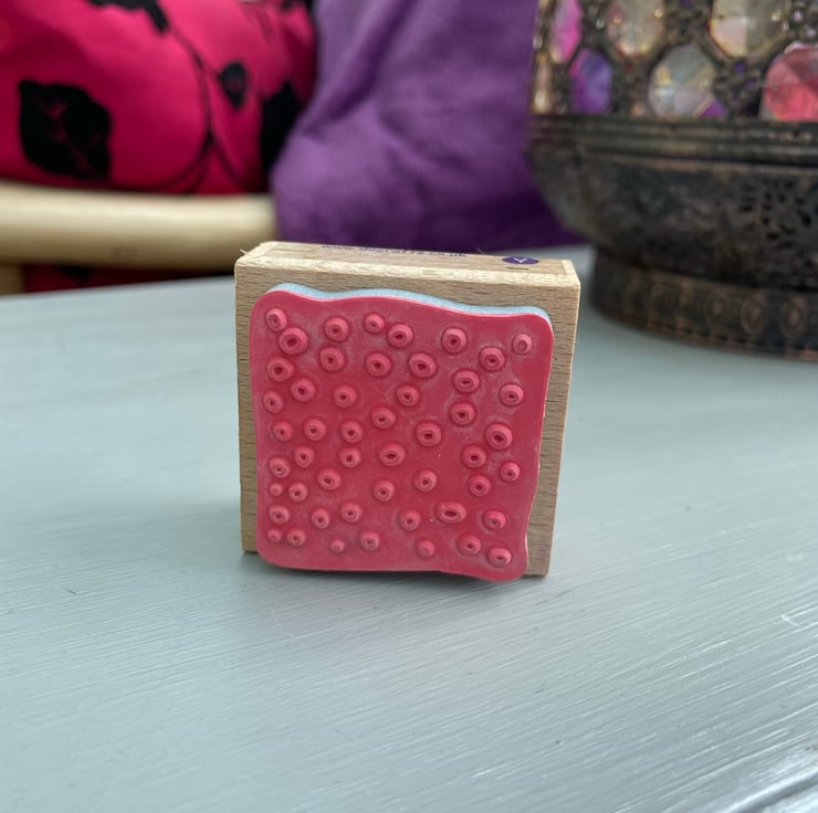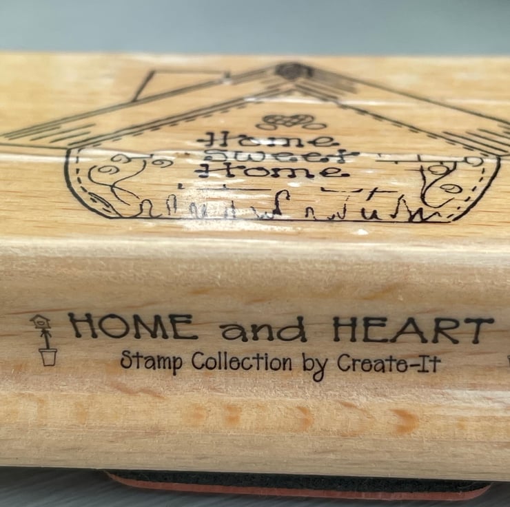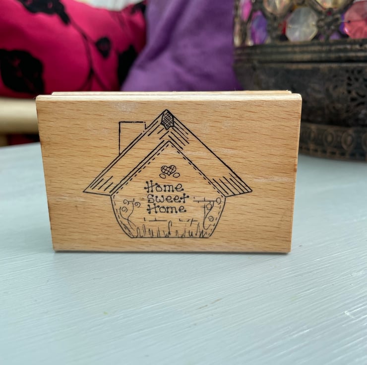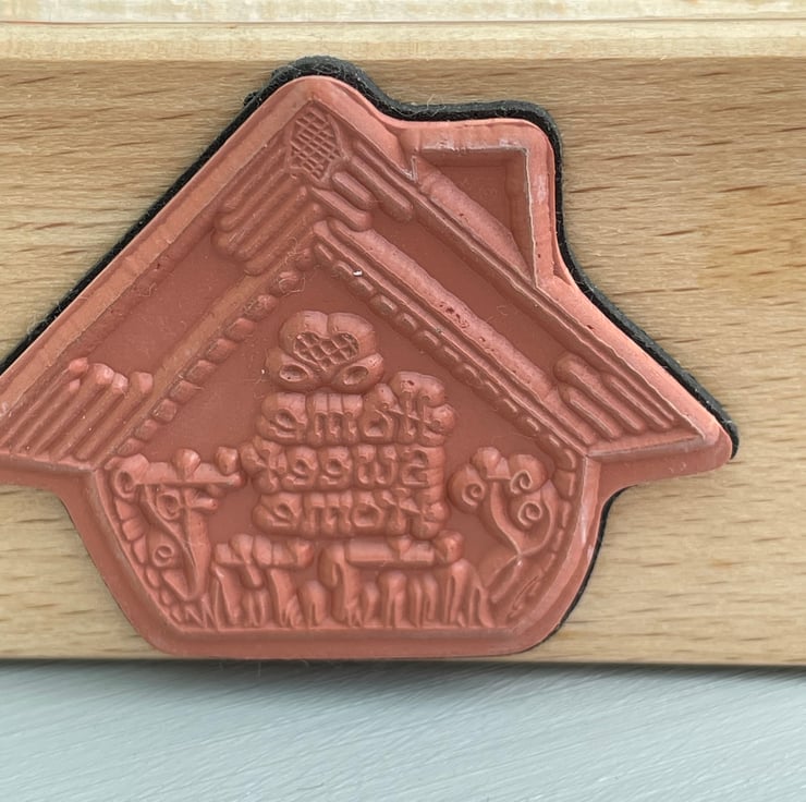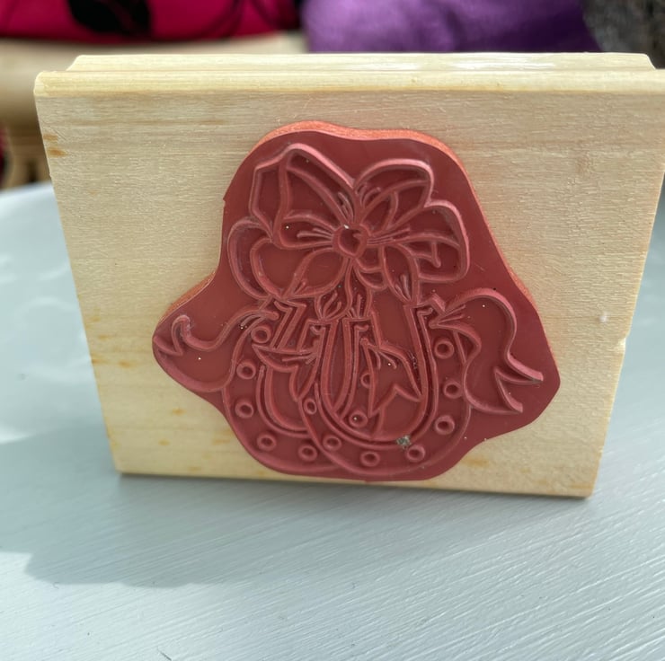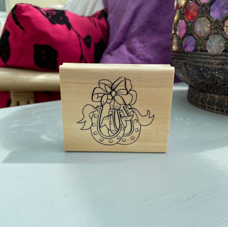 A set of 3 red rubber stamps monted on wooden blocks. The designs are 2 horseshoes tied with a bow by Anitas stamps 7.5x6cm, home sweet home house script stamp by create-it 7.5x5cm, random snow stamp by Whispers by docrafts 4.5x4.5cm. Each measurement is approximate and is the wooden block size and not the stamp. For use in all papercrafts.