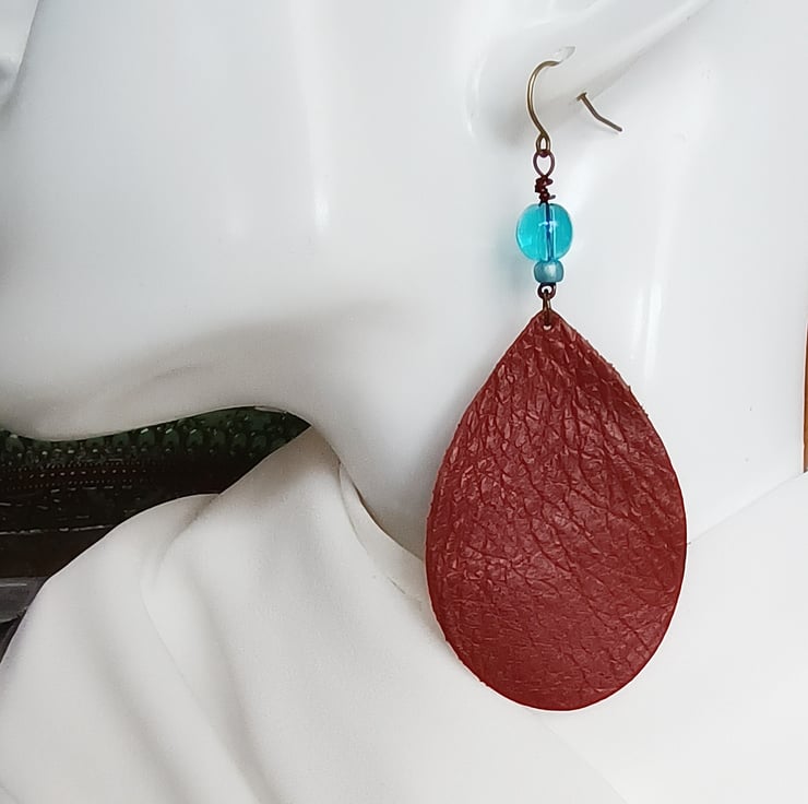 A gorgeous pair of Handmade Real Leather Teardrop pendant earrings. The Leather teardrop comes in a reddish brown colour, combined with lovely blue glass beads for a touch of contrast These earrings are truly Boho and Chic combined into one great pair of earrings. Eye catching and long, you’ll definitely get noticed.