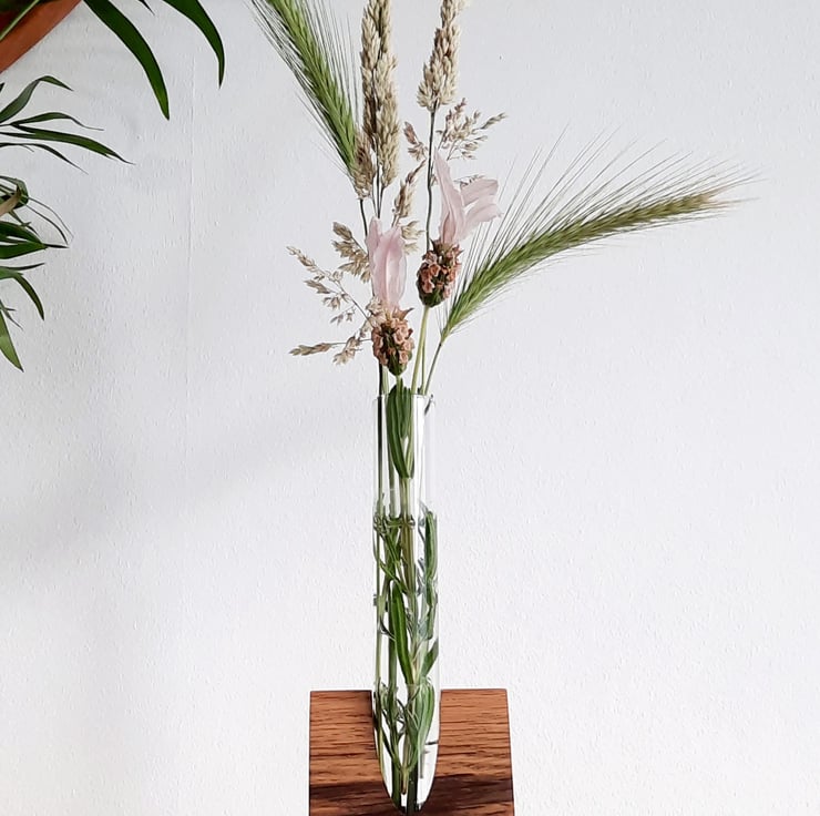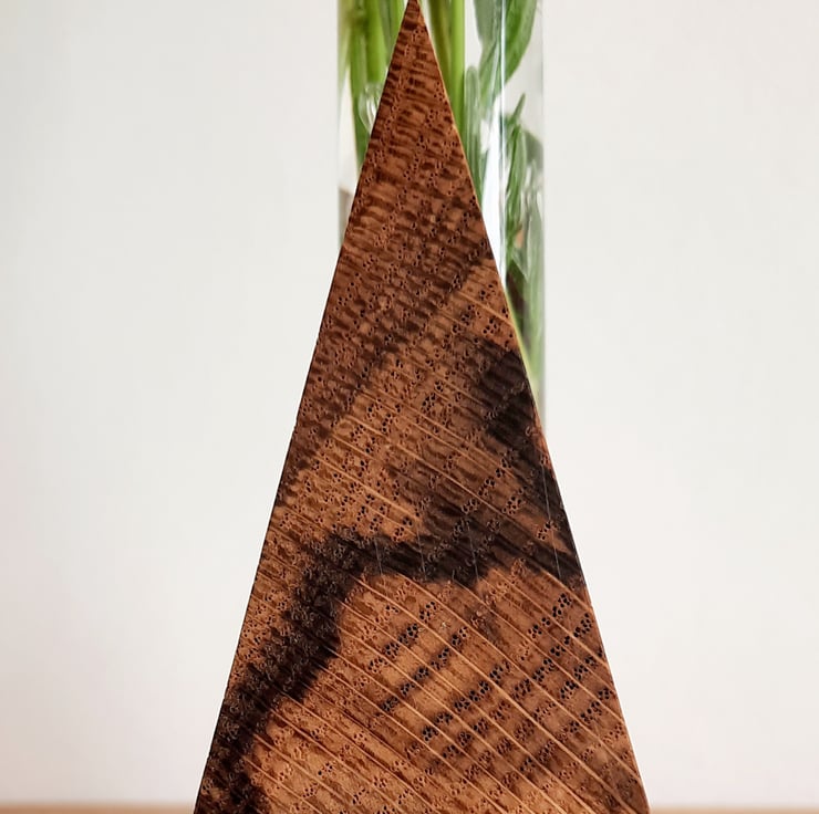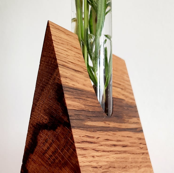 Our Oak & Glass Stem Vase base is handmade from a beautiful piece of locally sourced timber, with a very distinctive and vivid black grain pattern visible throughout the wood. This wood is completely unique, once these are sold, it won't be available again.