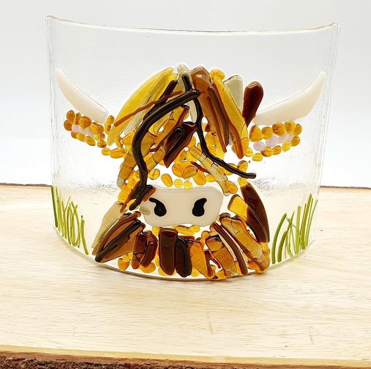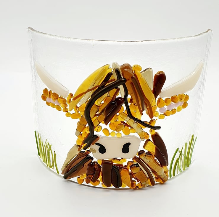 A fused glass Highland Coo created by layering ground coloured glass on a clear sheet of glass and fusing in a kiln. The glass tile is then put on a curve mould and fired a second time to create the shape.