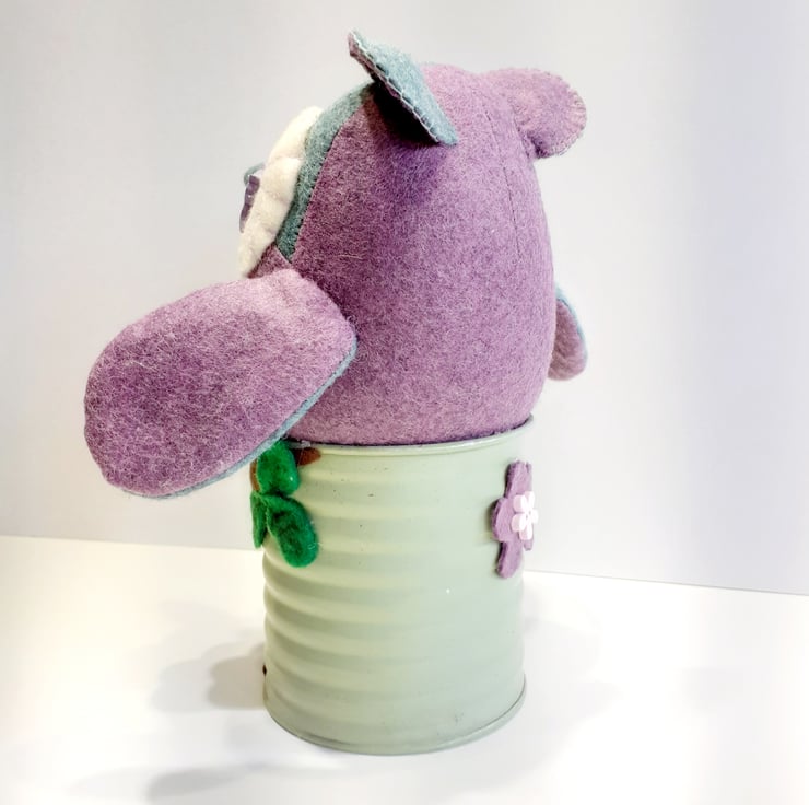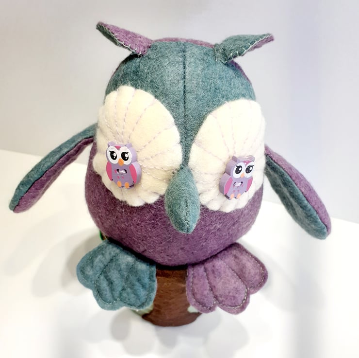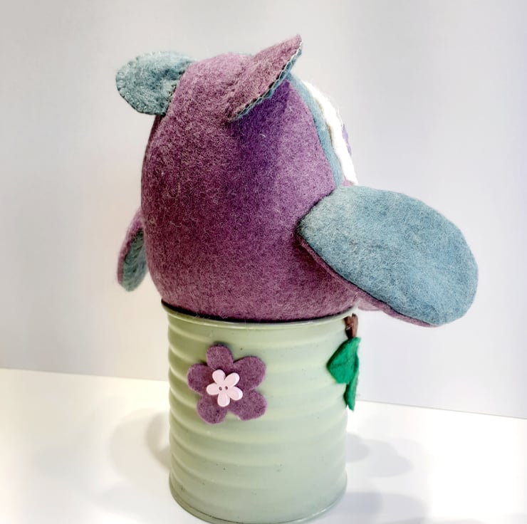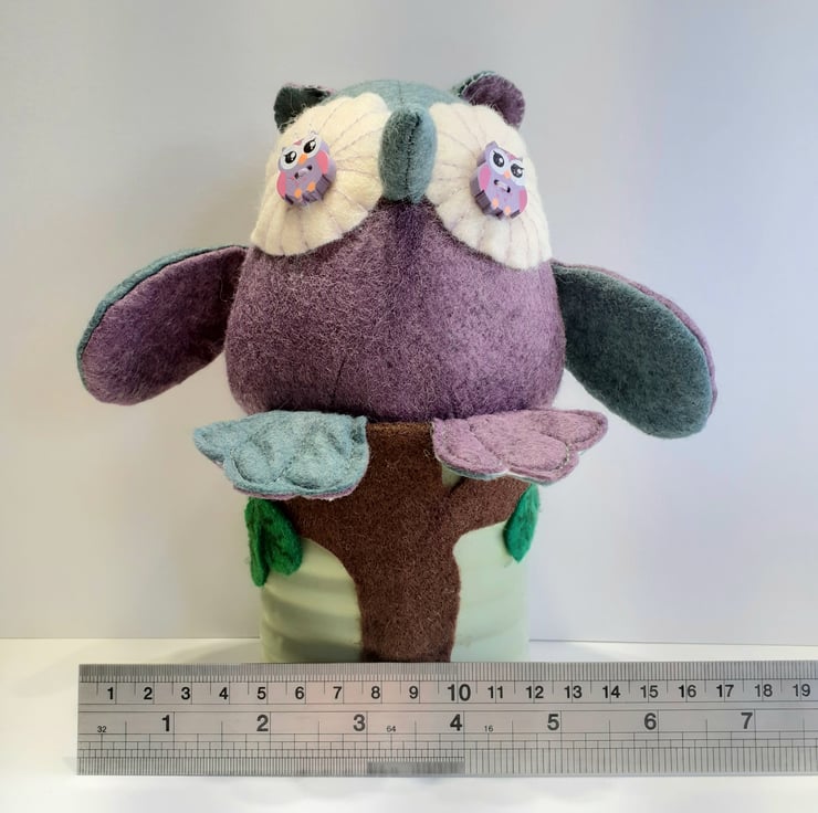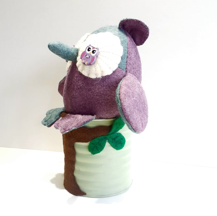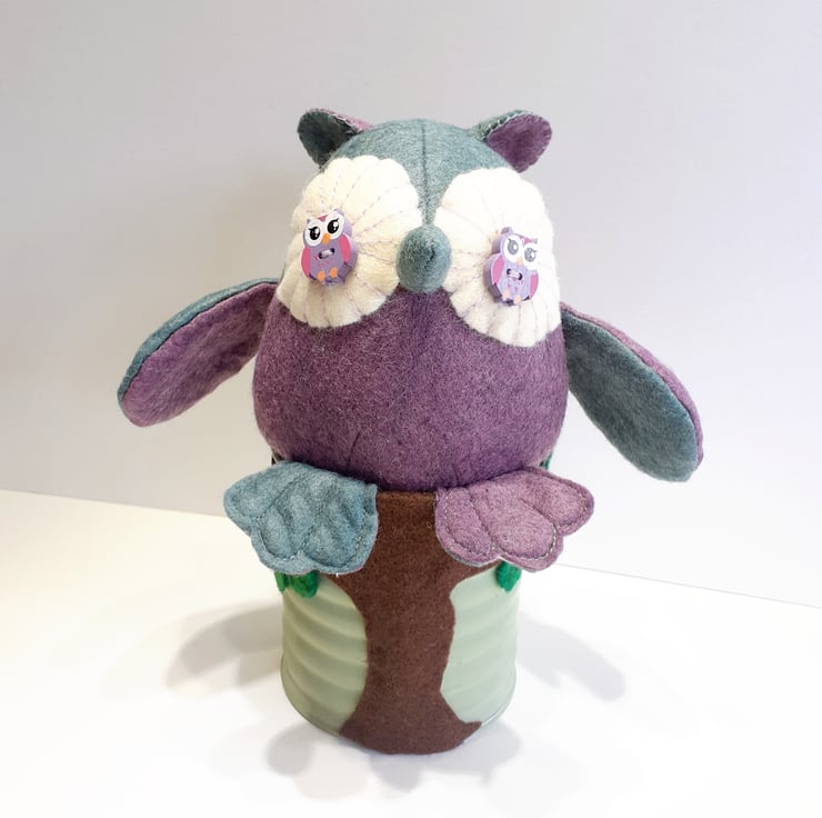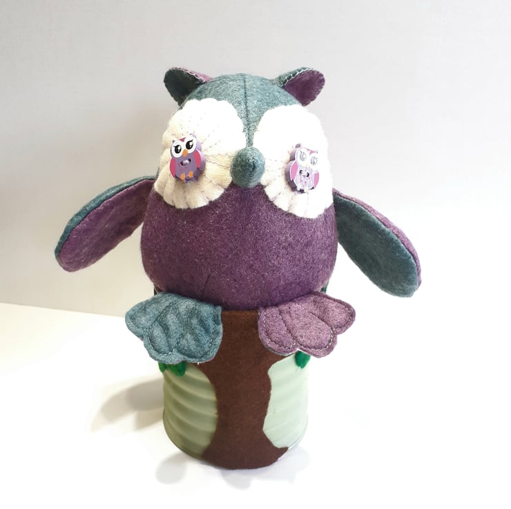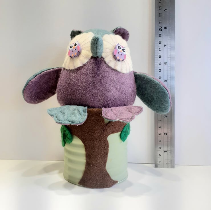 Made using in the main beautiful sage green and purple wool felt fabrics which I've swapped around the different pattern pieces and sitting in an old tin can, this cutie is now ready to fly to a new nest. Adding a brown felt tree trunk with felt leaves give the owl a fun perch to sit on. The tin can was once a herb pot which I held on and was the perfect stand making it easy to place in the perfect spot in your home. A very unique gift to give to anyone who is a lover of owls.