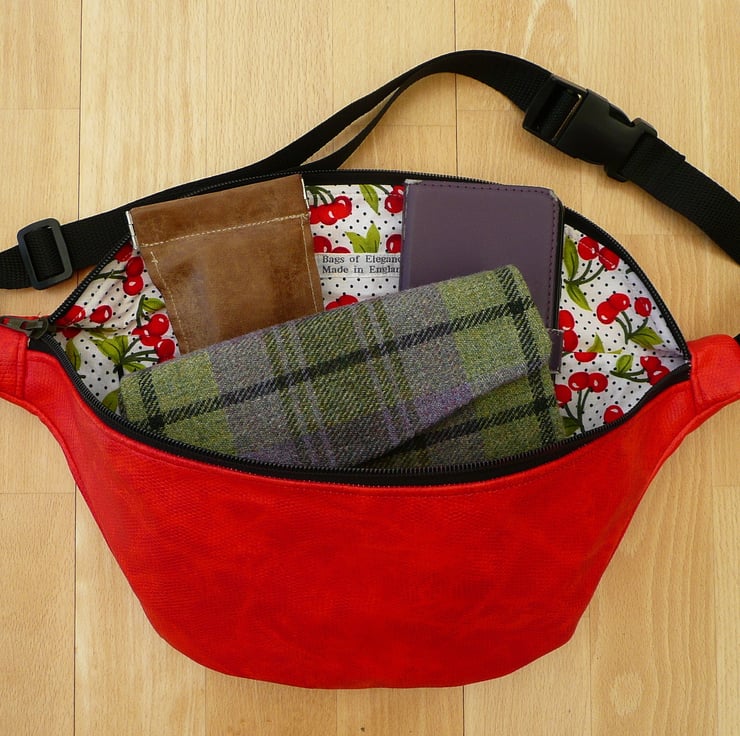 Made from PU red vinyl, this bag features a front zip pocket and an adjustable strap with a fastener, its fully lined in cherry print cotton.