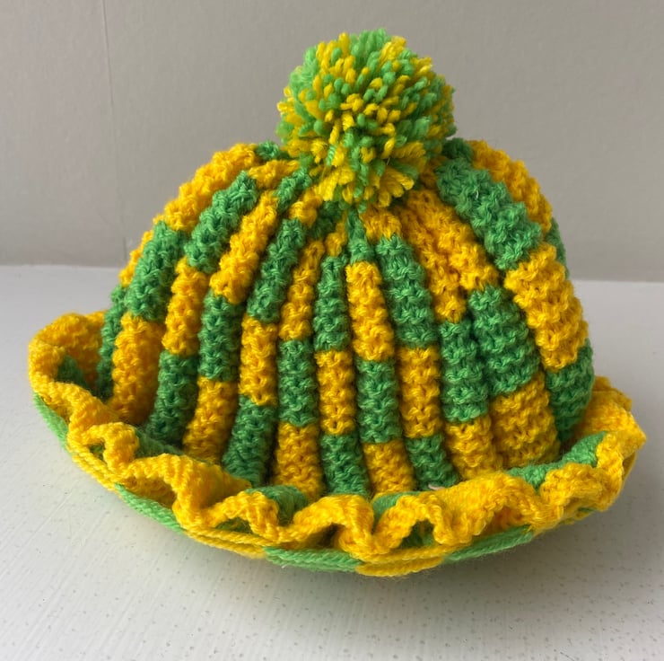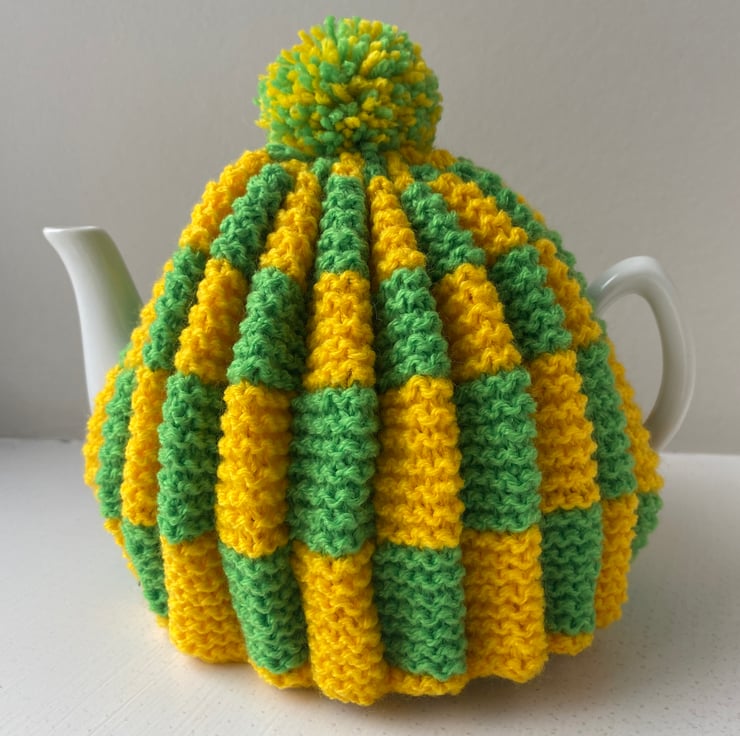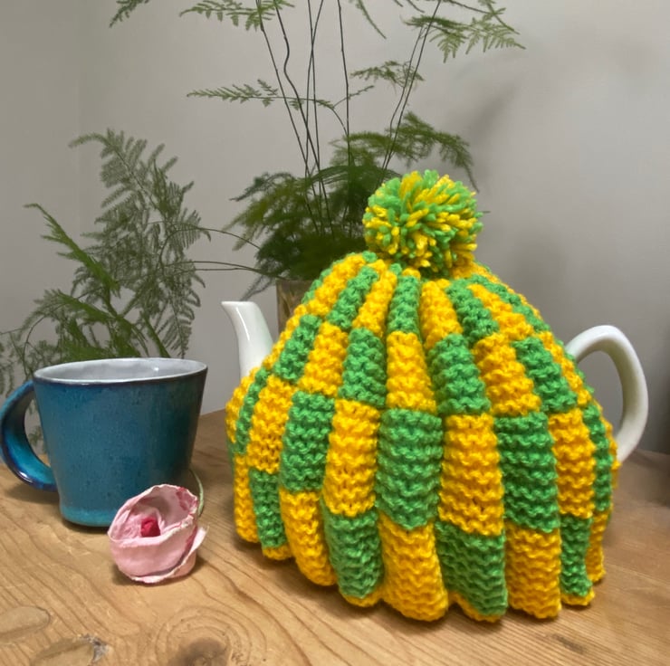 Handknitted tea cosy in a traditional design, with insulating ruffles which keep your tea warm and a matching pompom on top. This fits a 1 litre capacity teapot (4 regular mugs) and is 19cm across when flat and 17cm tall (without pompom). The colour is a cheerful green and yellow.