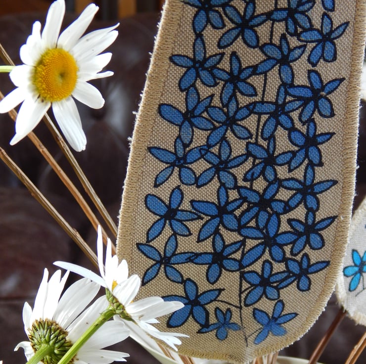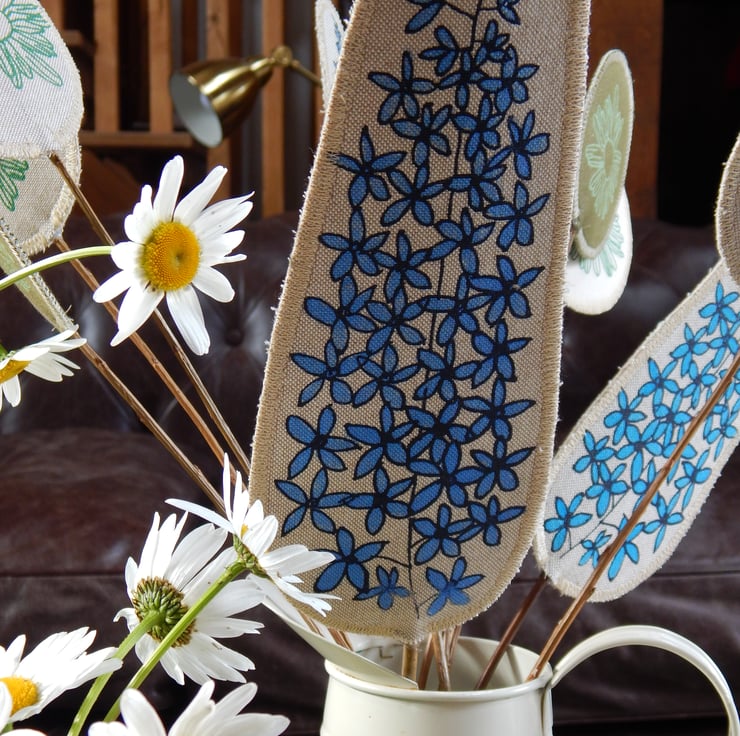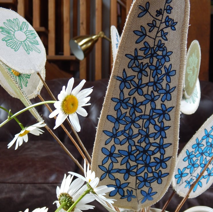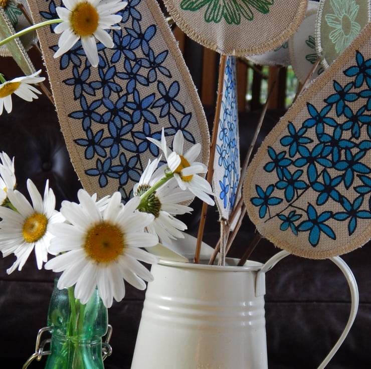 This is a bouquet of 10 fabric on willow creations. Each is double sided with interfacing for stability. They are all have running stitch and then a zig zig stitched finishing to ensure fraying is kept to a minimum. They are then hand glued onto willow which measures about 40 cm in length. The delphinium measures 27cm from top of fabric to the bottom of the fabric and 9 cm across at the widest point. The daisy circles are approximately 9cm across.
