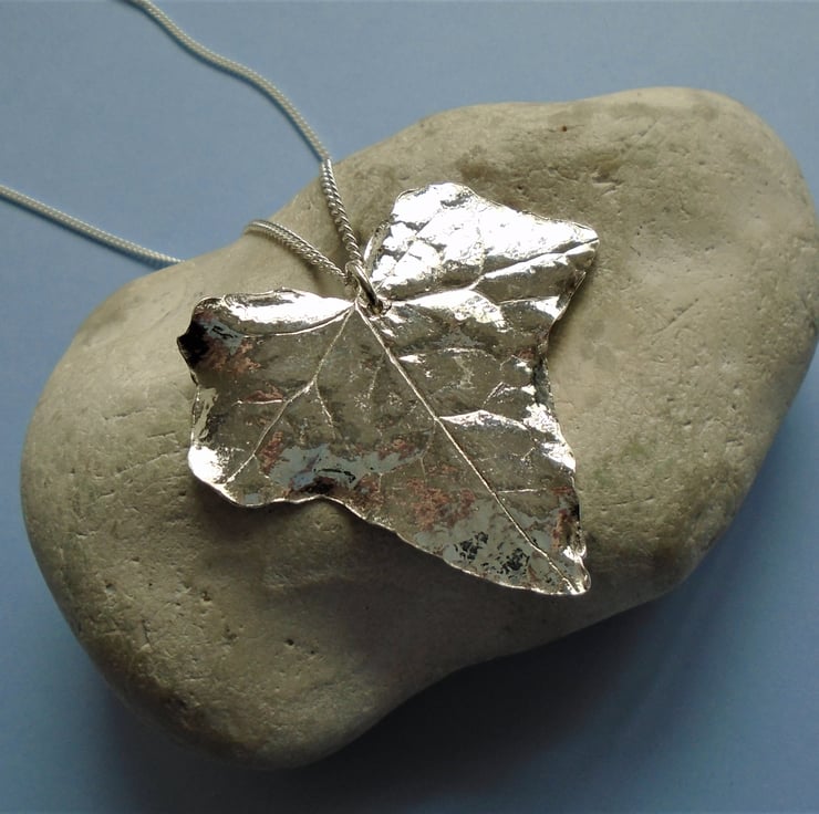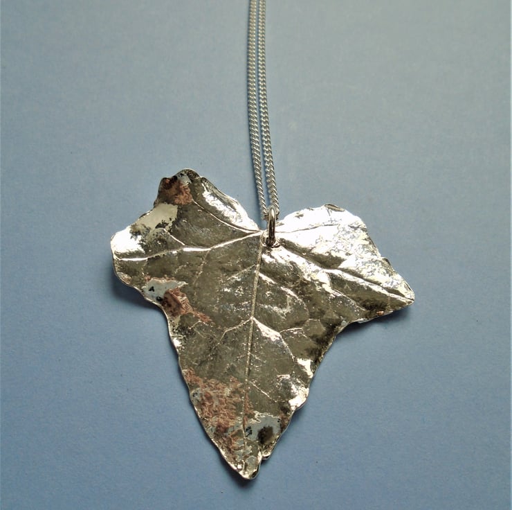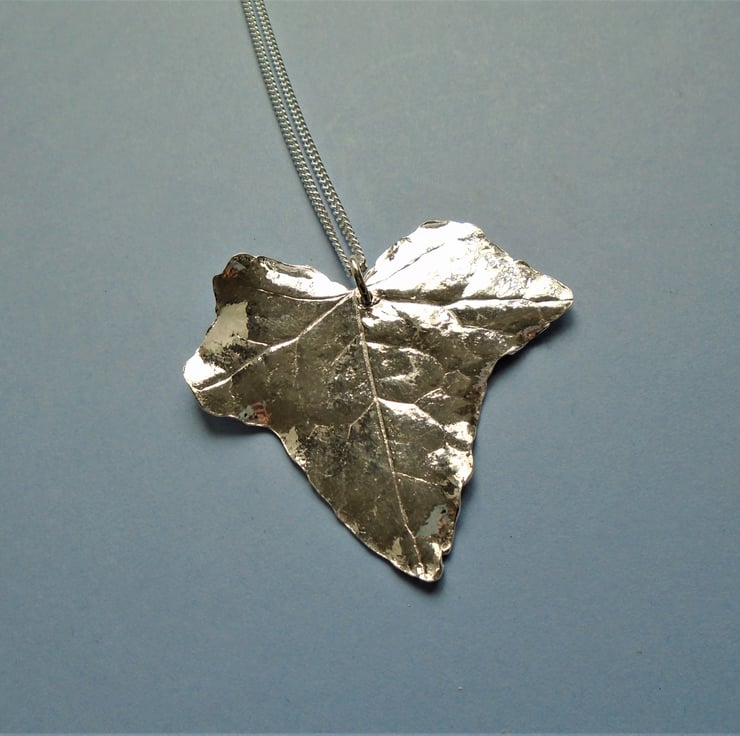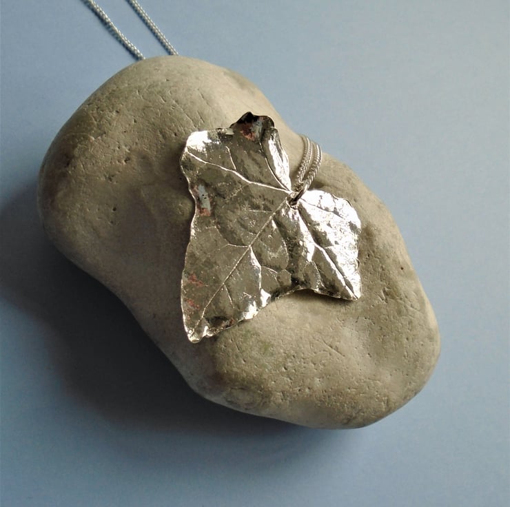 This pendant was made by coating a real ivy leaf in multiple layers of recycled fine silver (pure silver), leaving a detailed replica of the leaf after firing.