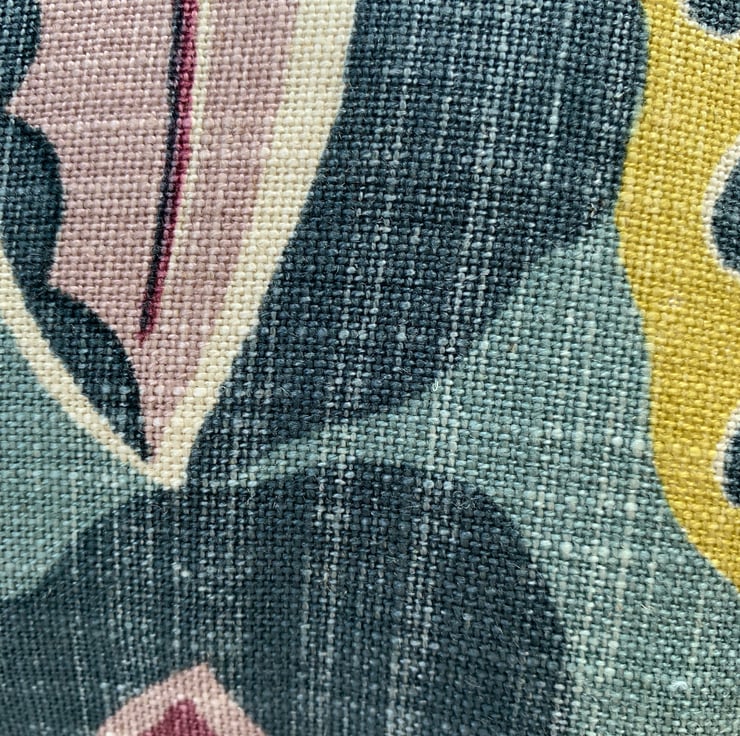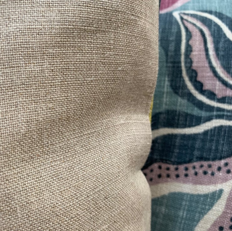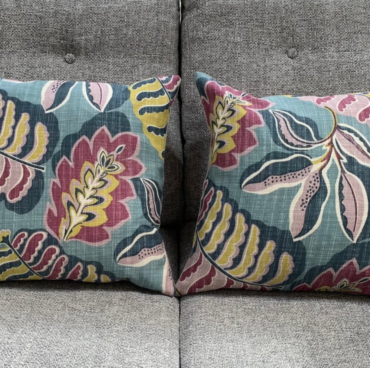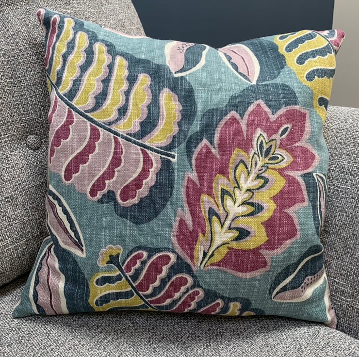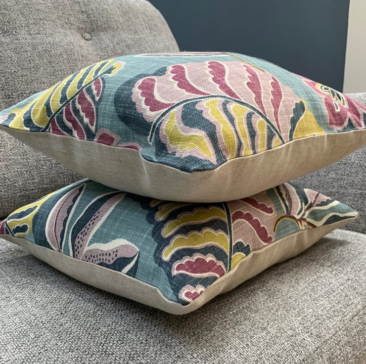 Colourful Sanderson Fitzroy Linen square cushion covers. This lovely botanical print combines pretty shades of teal, purple and green. It is backed with beige linen.