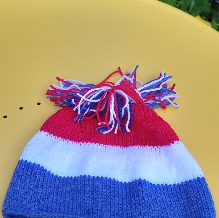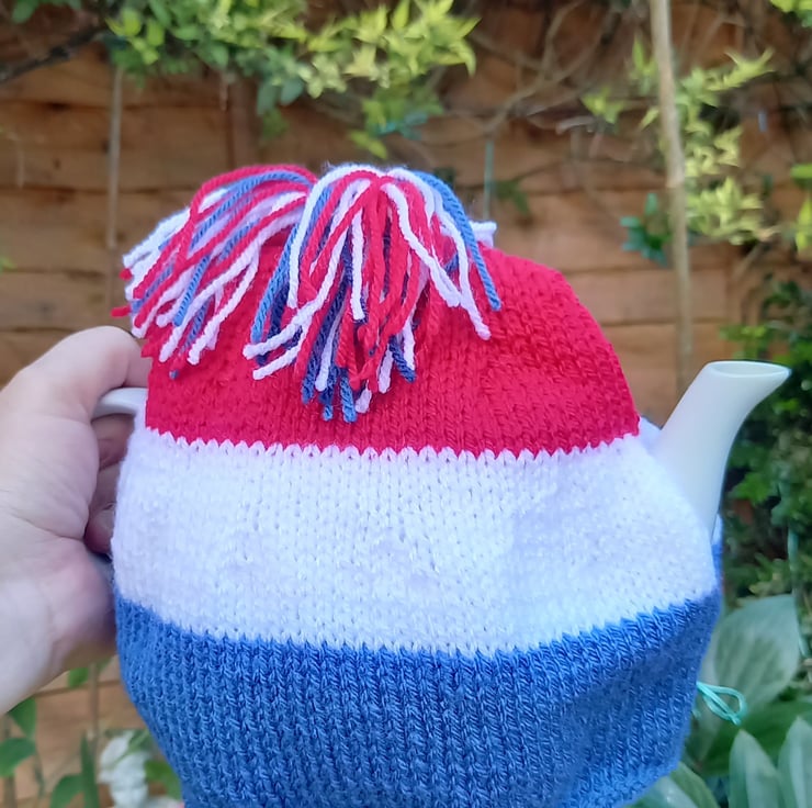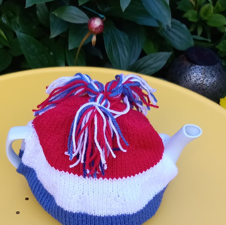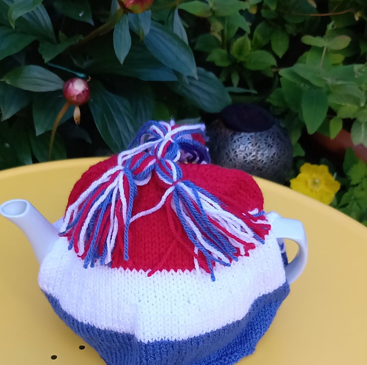 Hand knitted, red, white and blue tea cosy ,with three red white and blue tassels on top.