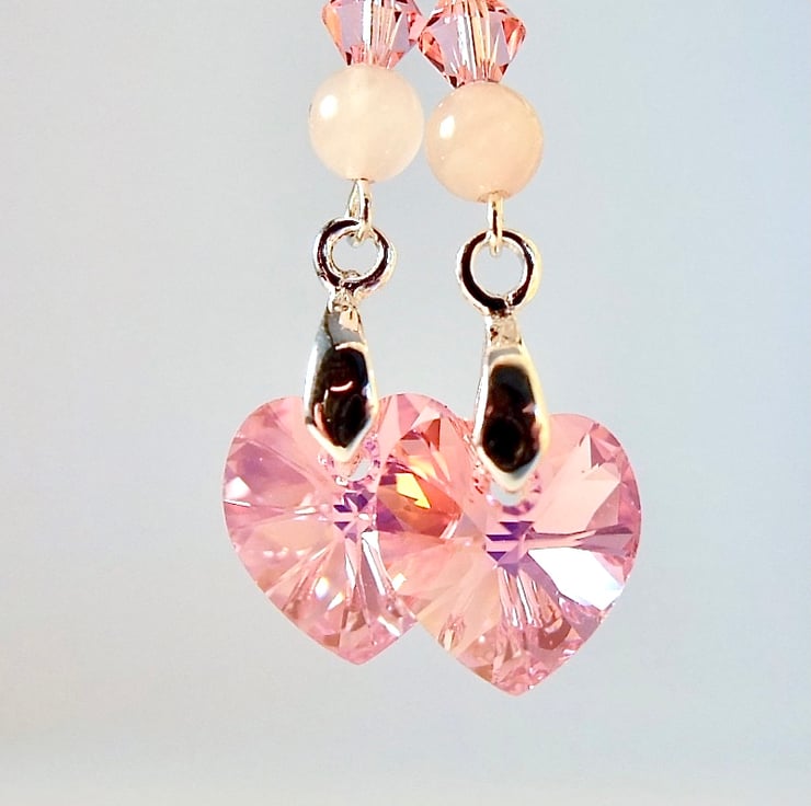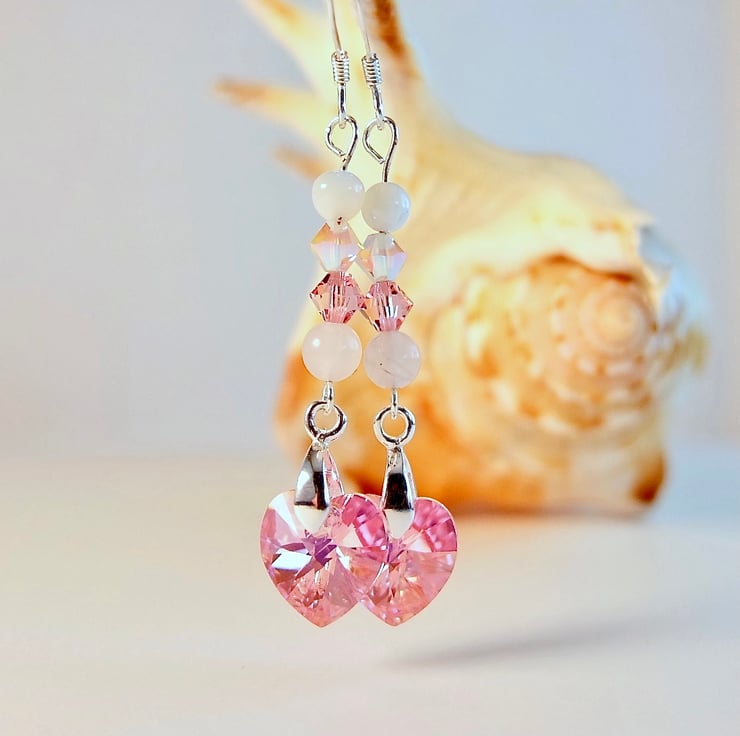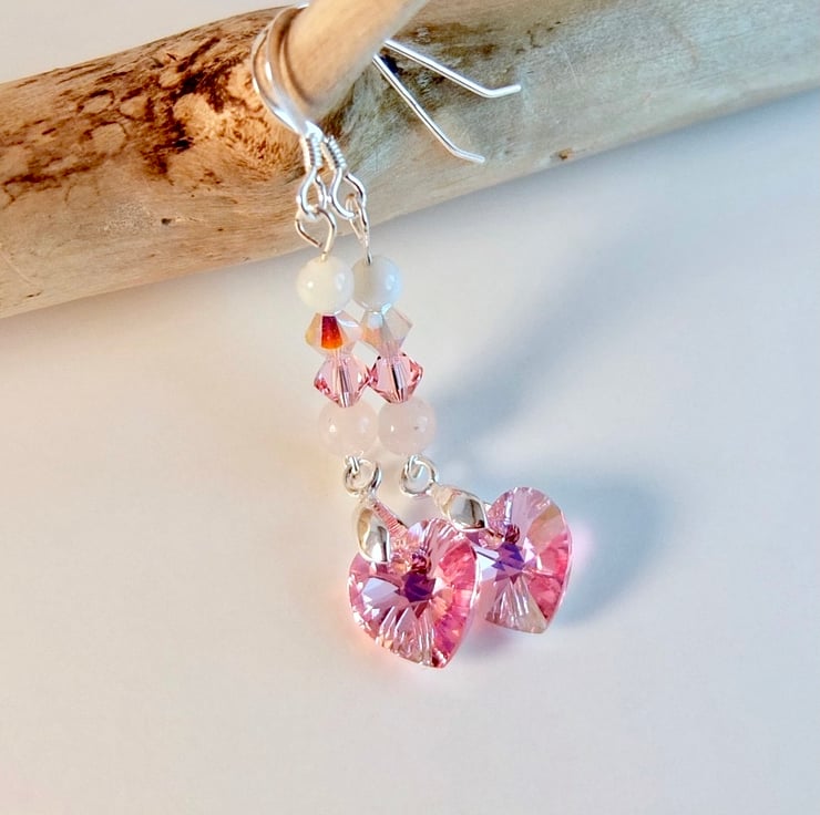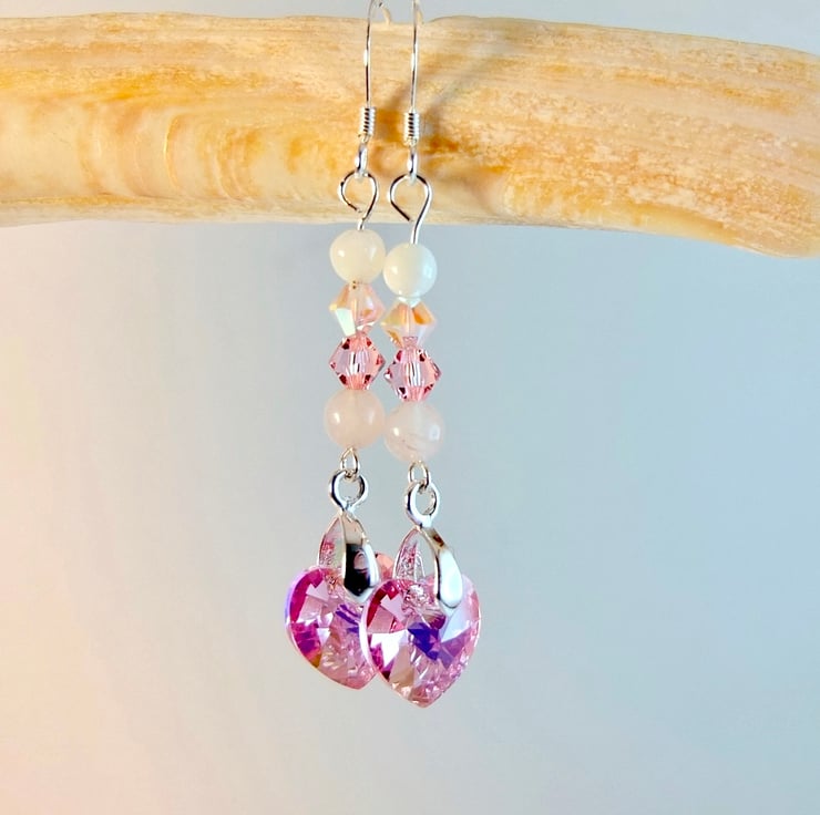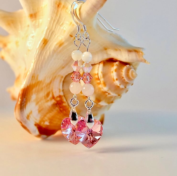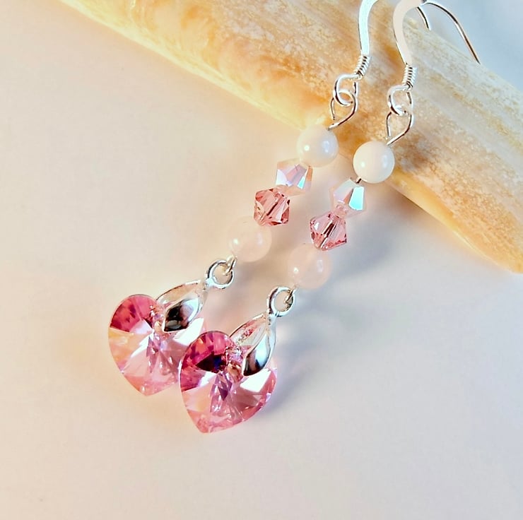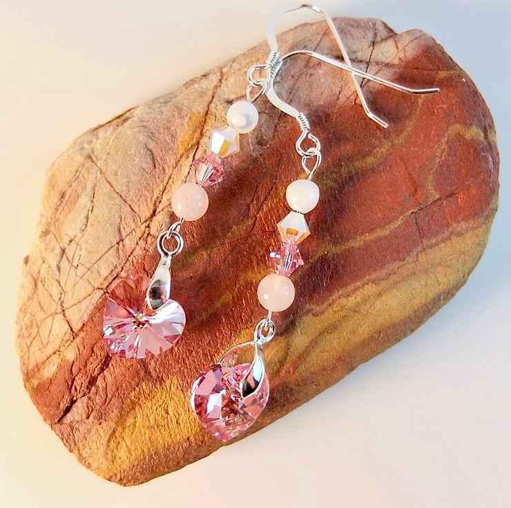 A 10mm, pink Swarovski crystal heart hangs below beads of 4mm rose quartz and mother-of-pearl, separated by a pair of Swarovski bicones in the colours 'light rose' and 'rosewater'.