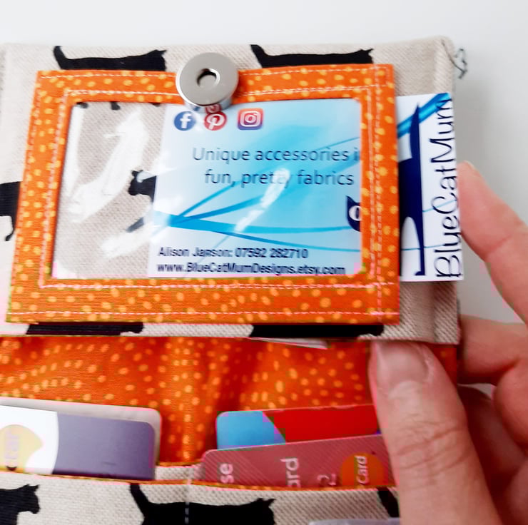 There's enough room to hold two bank cards in each of the four compartments. The big pocket is great for extra cards, paper money, receipts or vouchers. A clear pocket for ID card or a photo, and a small pocket on the back for coins.
