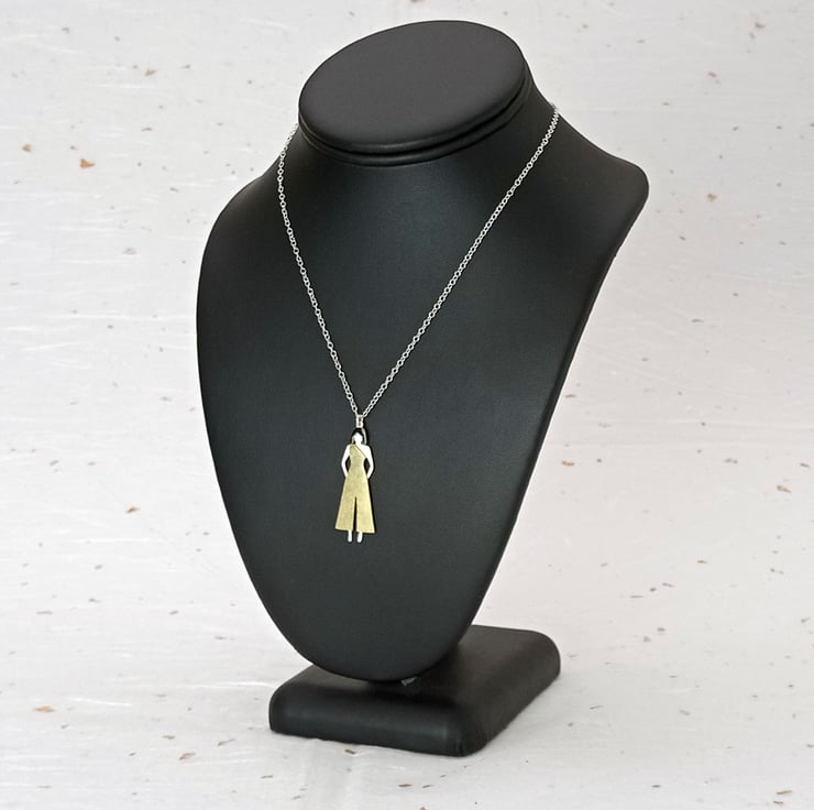 I have created this necklace using recycled sterling silver and brass. I have cut by hand different shapes; after adding texture to the brass jumpsuit, the pieces were soldered together. After filing and finishing, I painted the hair with enamel paint and attached the lady to sterling silver chain. She is a one of kind necklace, so once sold won't be replaced!