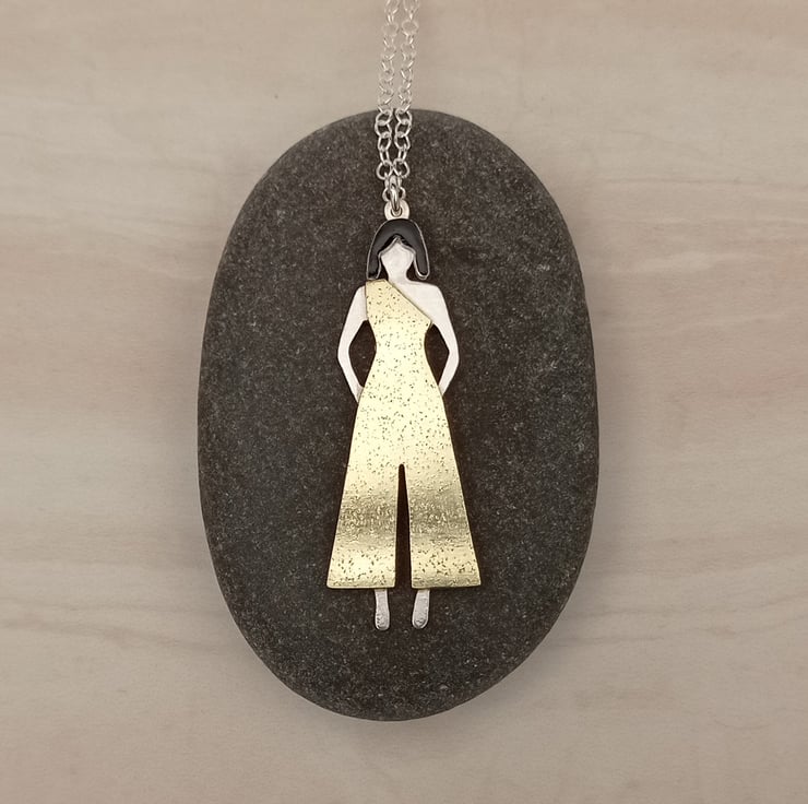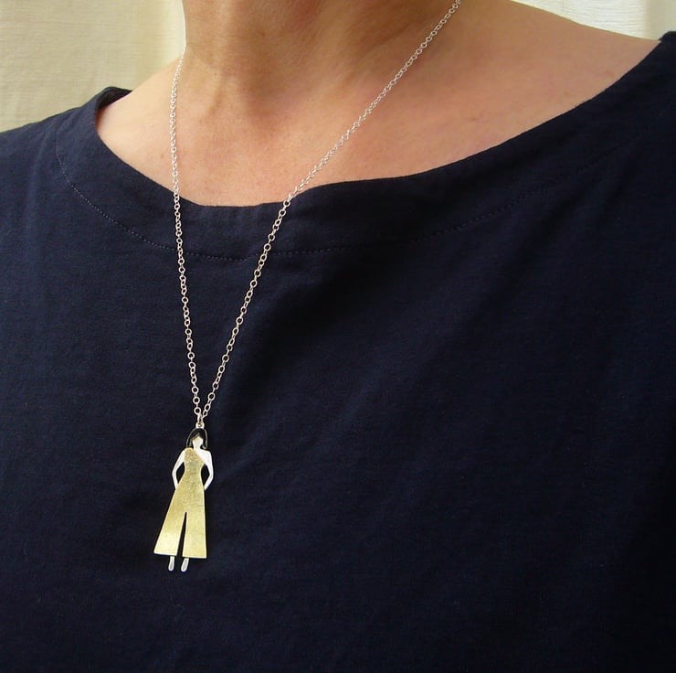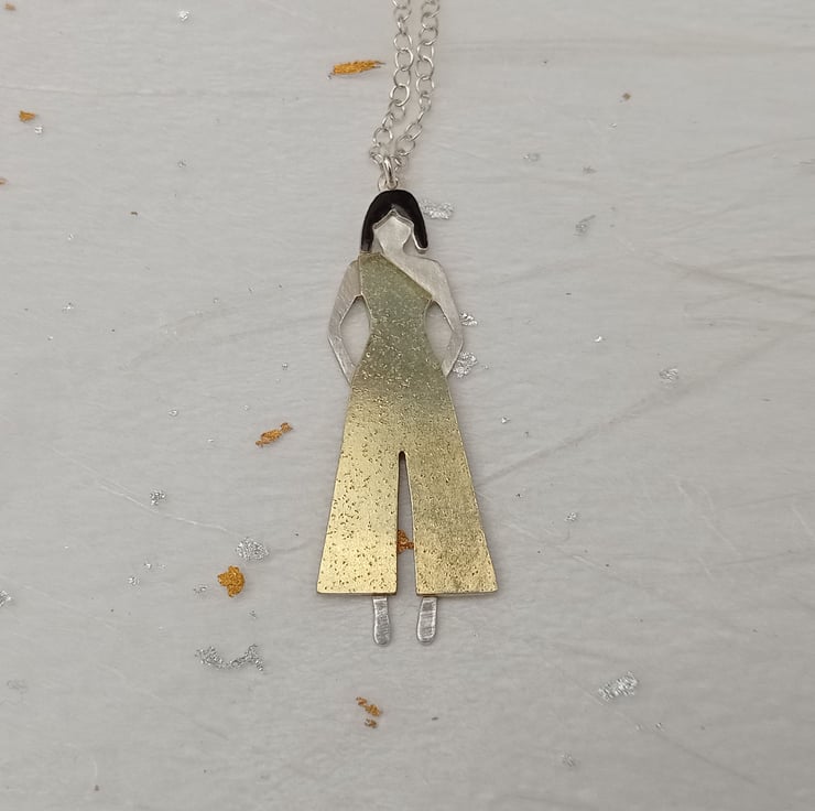 I have created this necklace using recycled sterling silver and brass. I have cut by hand different shapes; after adding texture to the brass jumpsuit, the pieces were soldered together. After filing and finishing, I painted the hair with enamel paint and attached the lady to sterling silver chain. She is a one of kind necklace, so once sold won't be replaced!