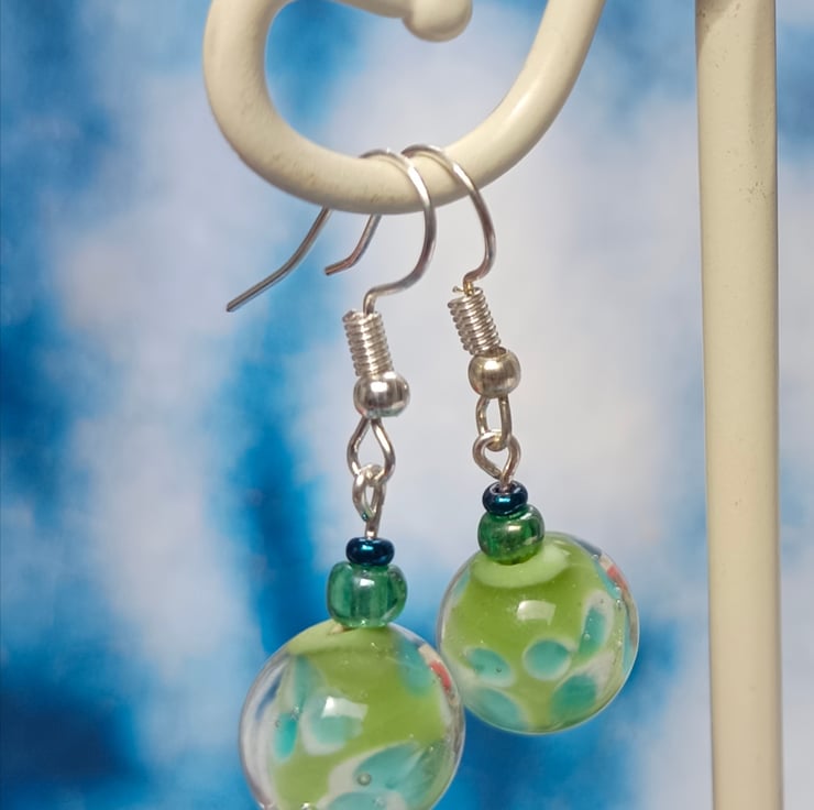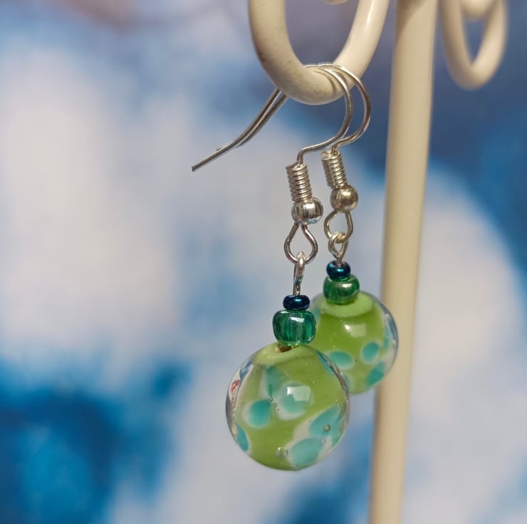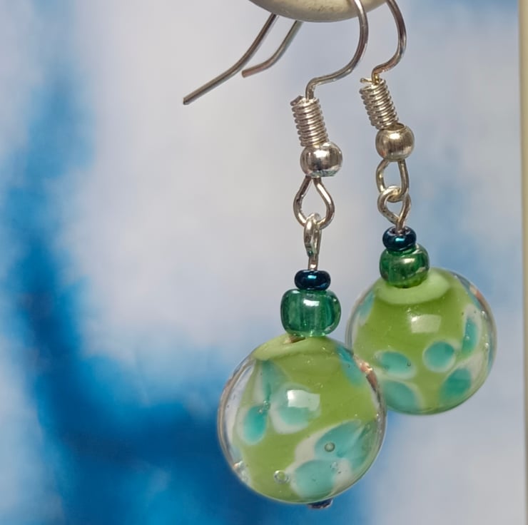 Unusual and very lovely lampwork glass beads in shades of green with tiny glass beads in green and blue. Hanging on sterling silver nickel free hooks. Free UK postage.