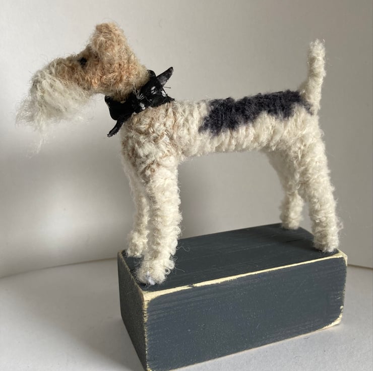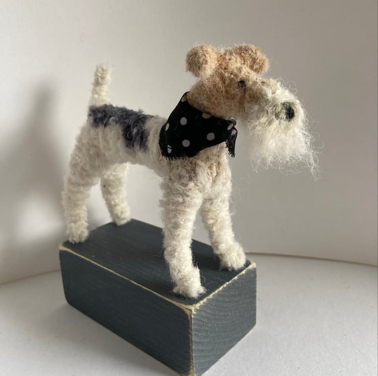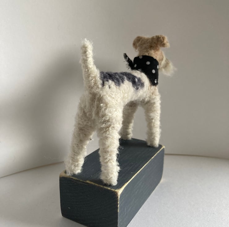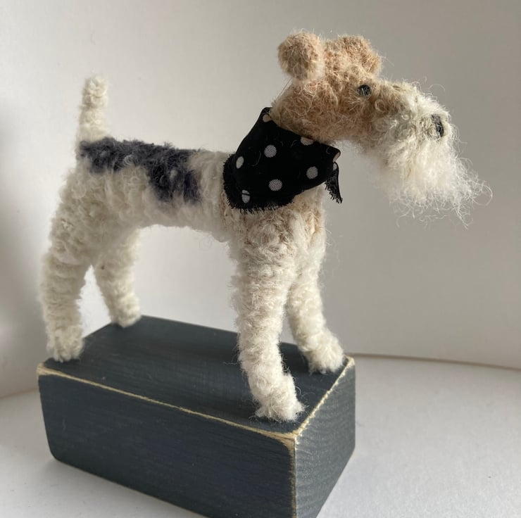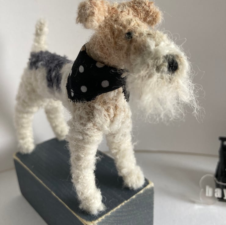 Handmade Lakeland Terrier. He stands on a wooden plynth which has been painted and aged. He has a red and white spotty bandana and some beautiful whiskers.