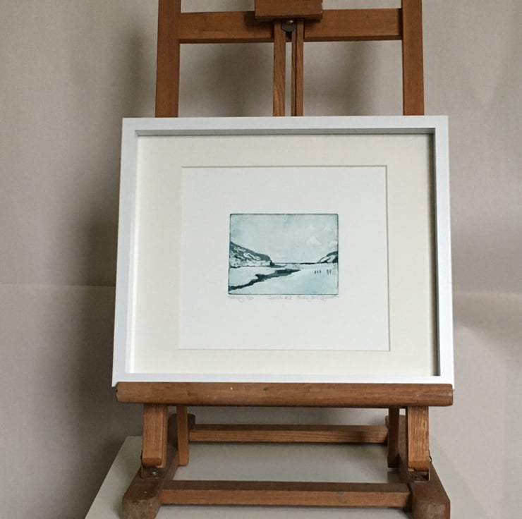 Aquatint & Hardground Etching. 10 x 7.5cm plate. Printed with a mix of Prussian blue and ochre in colour fast Caligo etching ink on Fabriano Rosapina. This is 1/10 of a variable edition in different shades and combinations of inks. White frame with inner card mount. Overall size 30 x 25cm