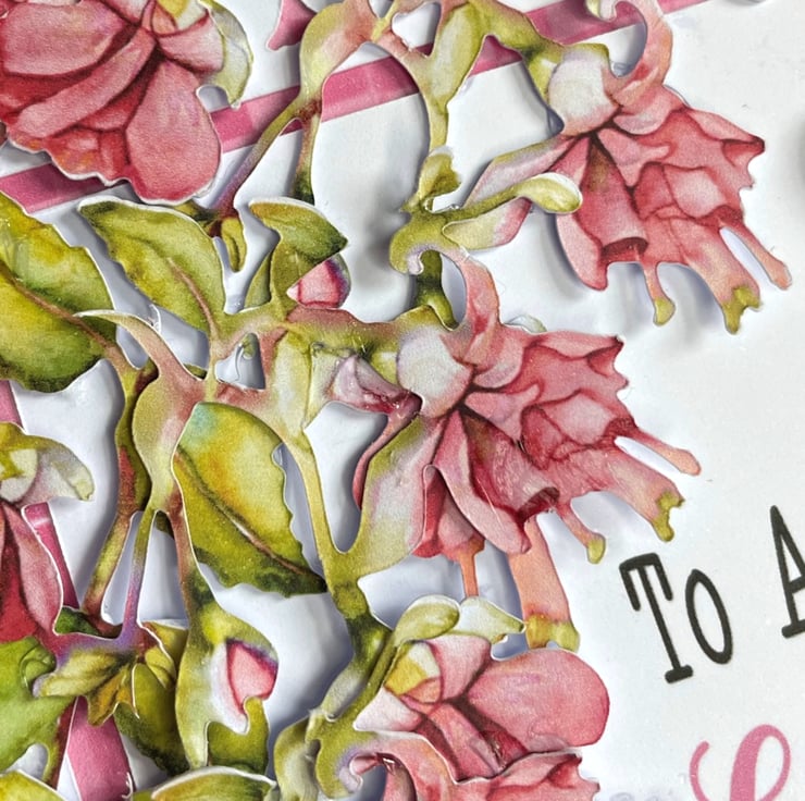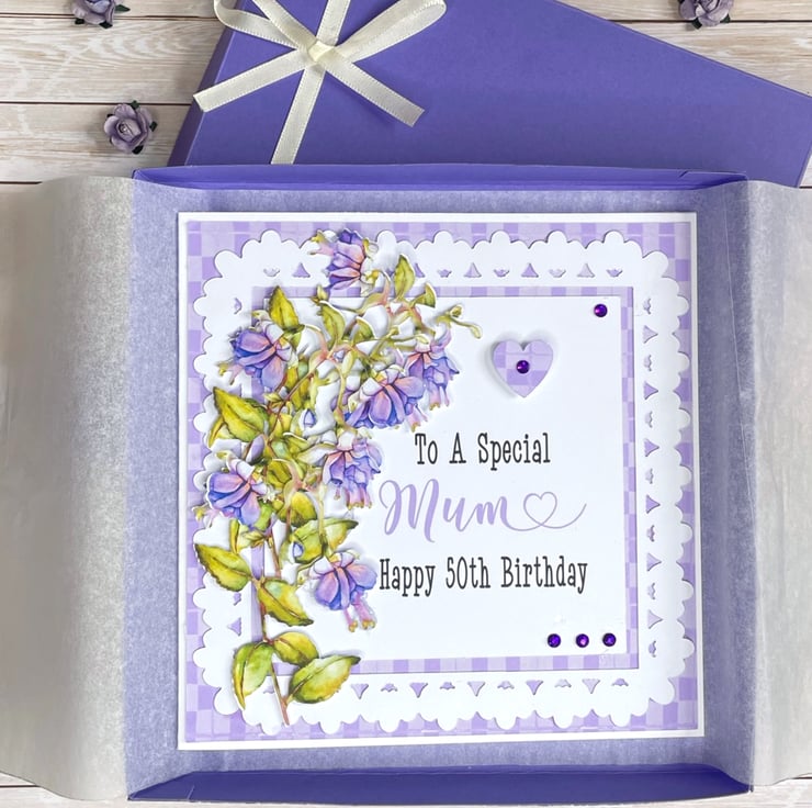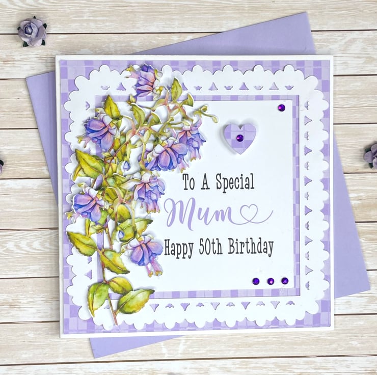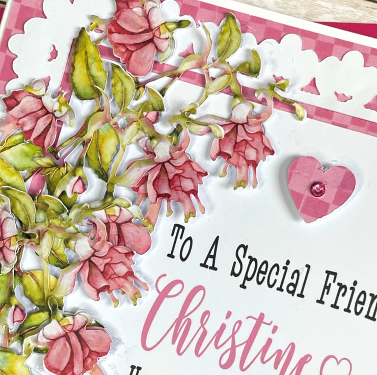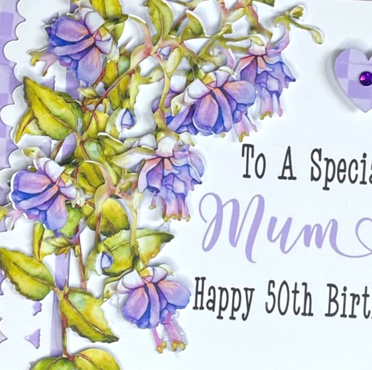A handmade, personalised birthday card featuring pretty decoupaged fuchsias, available in either purple or pink. The fuchsias, backing paper, heart, gems and text (for the name) will all mirror your choice of colour.