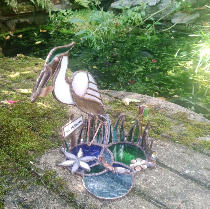 Having made a variety of hanging birds I thought I'd try my hand at a free standing one. This beautiful heron complete with fish in beak (despite the no fishing sign) is standing on one leg in a lagoon of blue and green water surrounded by grasses and bull rushes with floating water lily flowers and polished stones. Looks great on a window sill, in the garden, as a centre piece on the dining table or on a side table under a lamp. A great way to bring a touch of nature indoors and the perfect gift for bird lovers, gardeners, anglers or as an anniversary present.