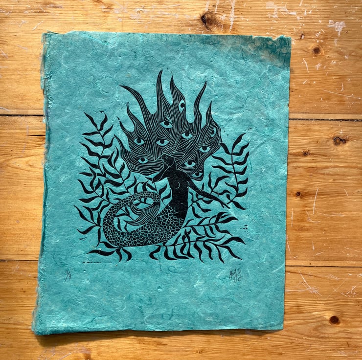 This linocut is printed in black ink on handmade, sea green, Nepalese lokta paper.