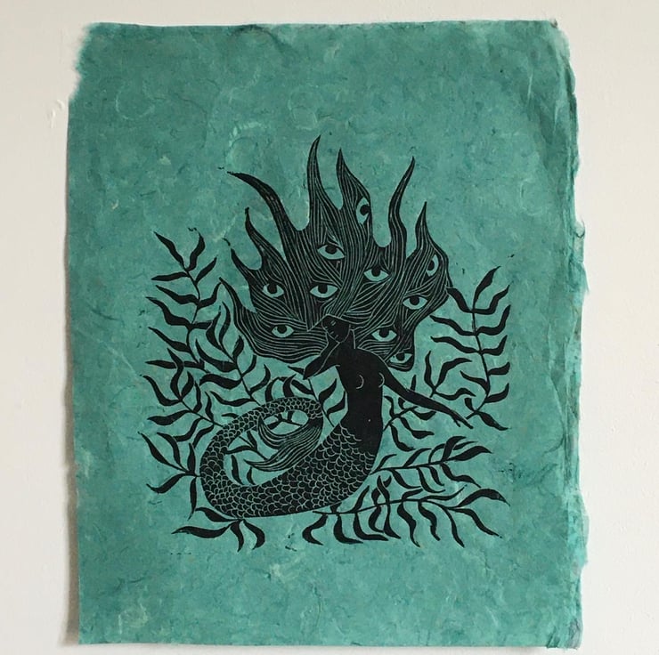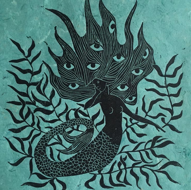 A linocut print of a mermaid in seaweed, her wild hair flowing in the water and a hint of something sinister lurking in the depths.