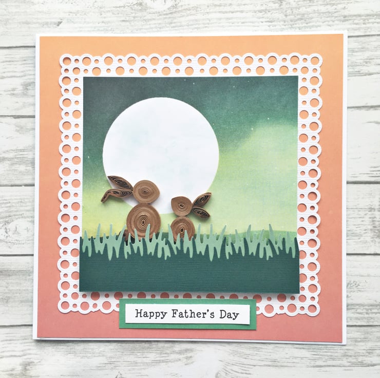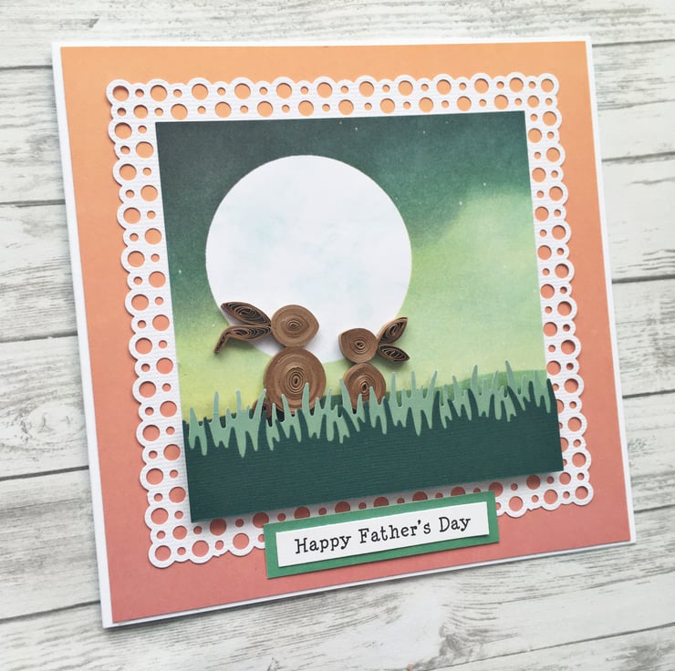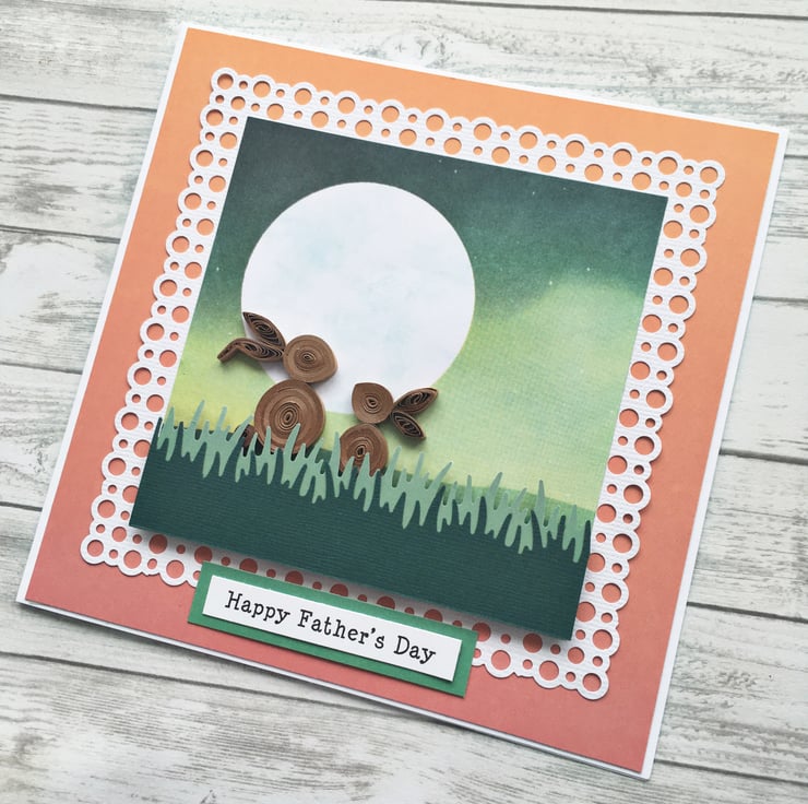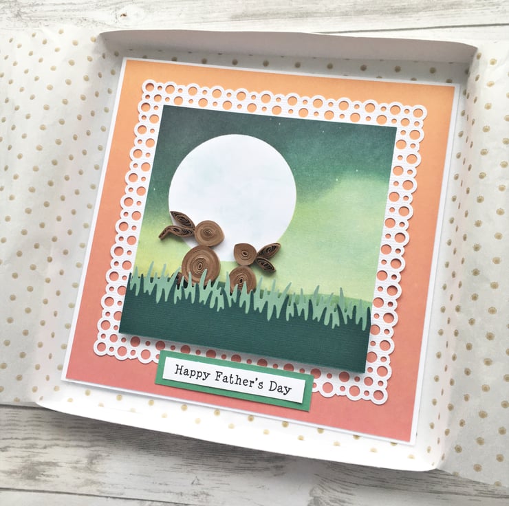 This is a lovely hand-quilled Father’s Day card showing a Daddy rabbit with his rabbit-child who is gazing up at him in the light of the moon.