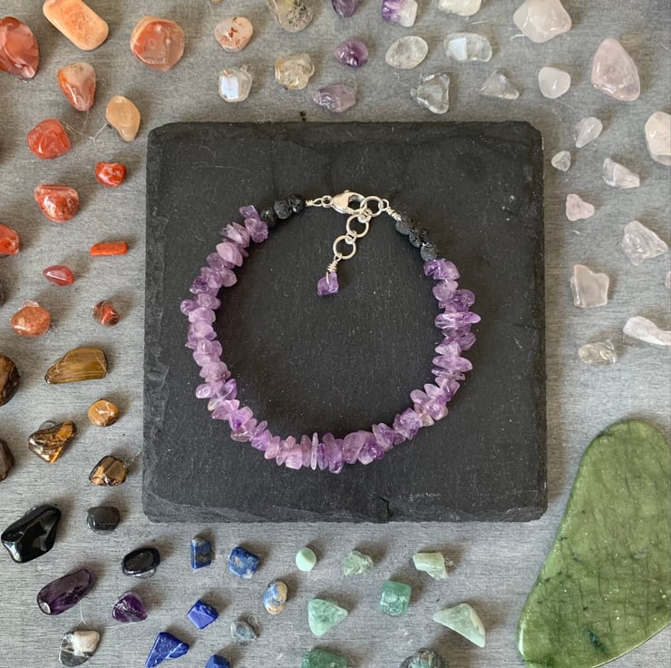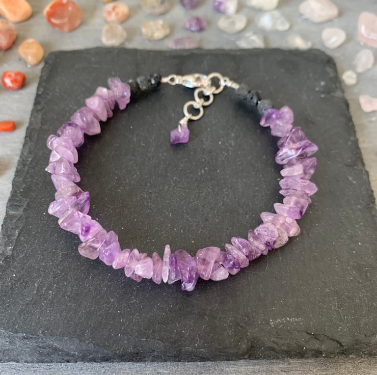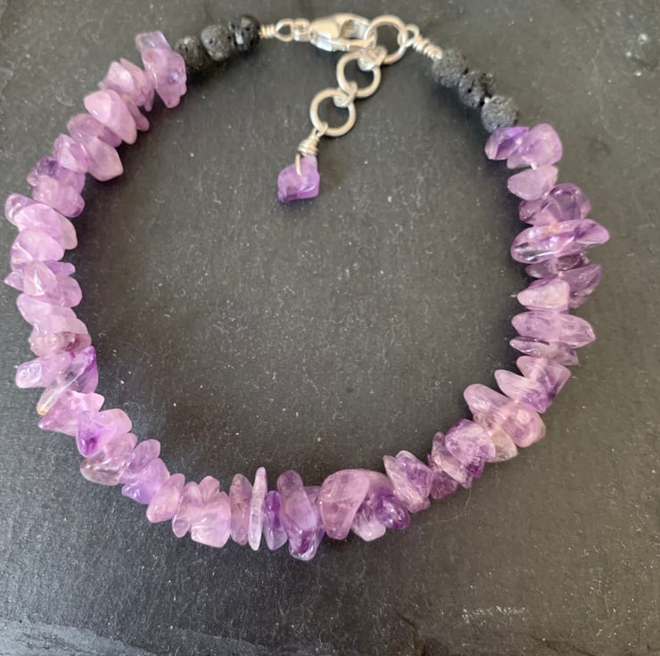 A stunning lilac toned Amethyst bracelet with volcanic lava stones for diffusing aromatherapy oils.