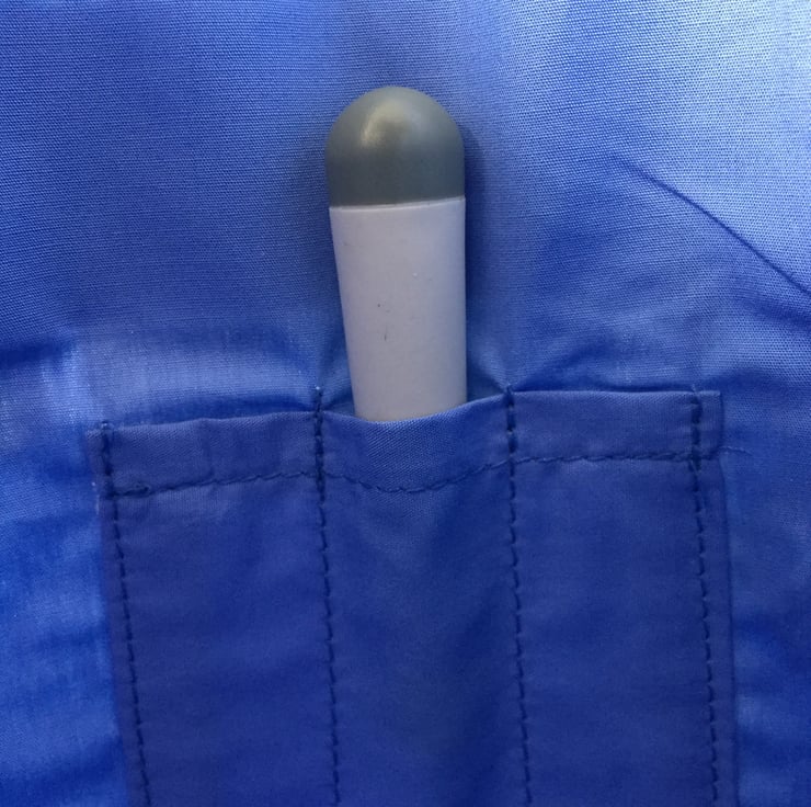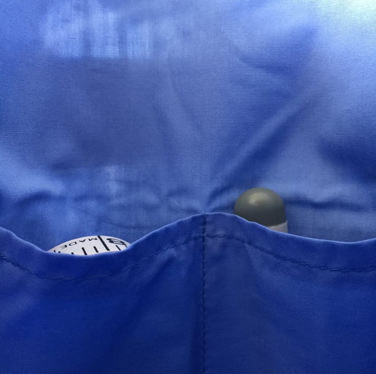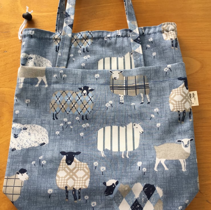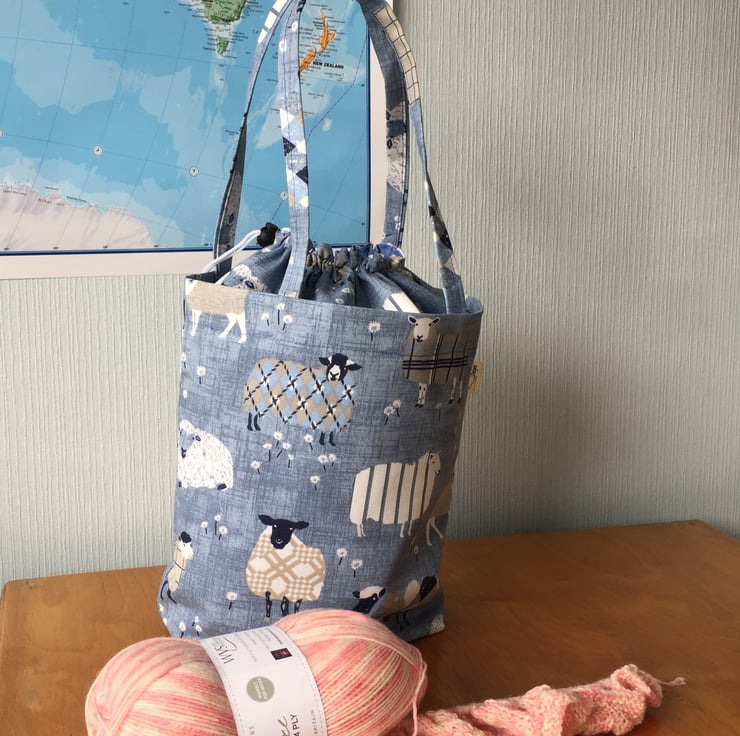 This delightful knitting bag is handmade from a heavy cotton fabric with a poly/cotton lining. It has a drawstring top to keep your work free from dust and has two carrying handles. The lining has 3 narrow pockets on one side for storing needles etc and 2 larger pockets on the other side.