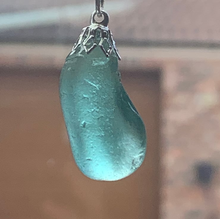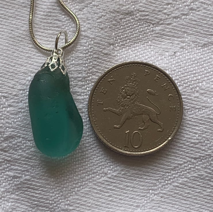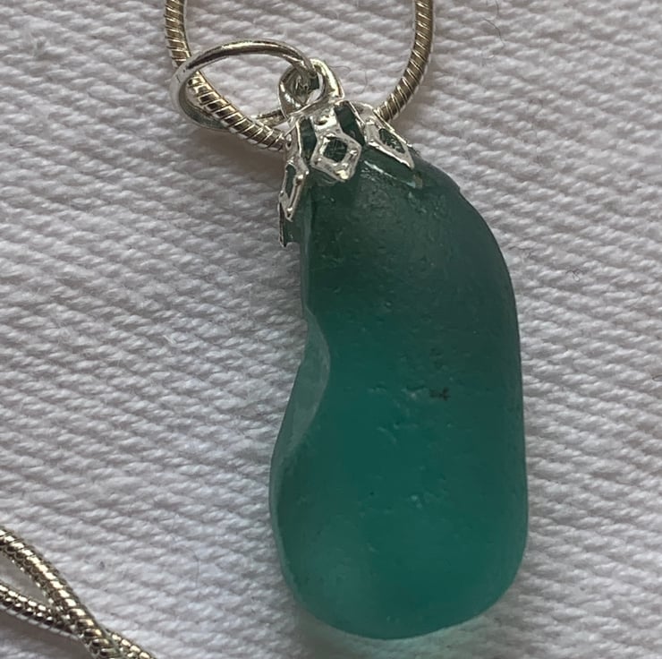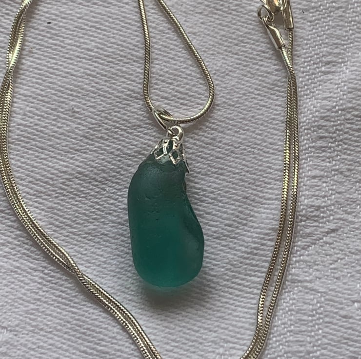 This unusual, rich teal coloured piece of glass has been topped with silver plate filigree bail and attached to an 18 inch silver plate snake chain. The colour is really set off by the silver.
