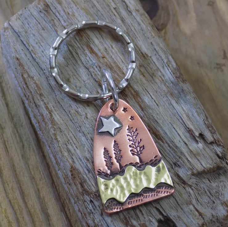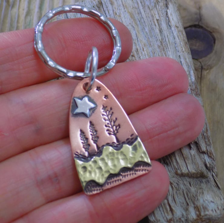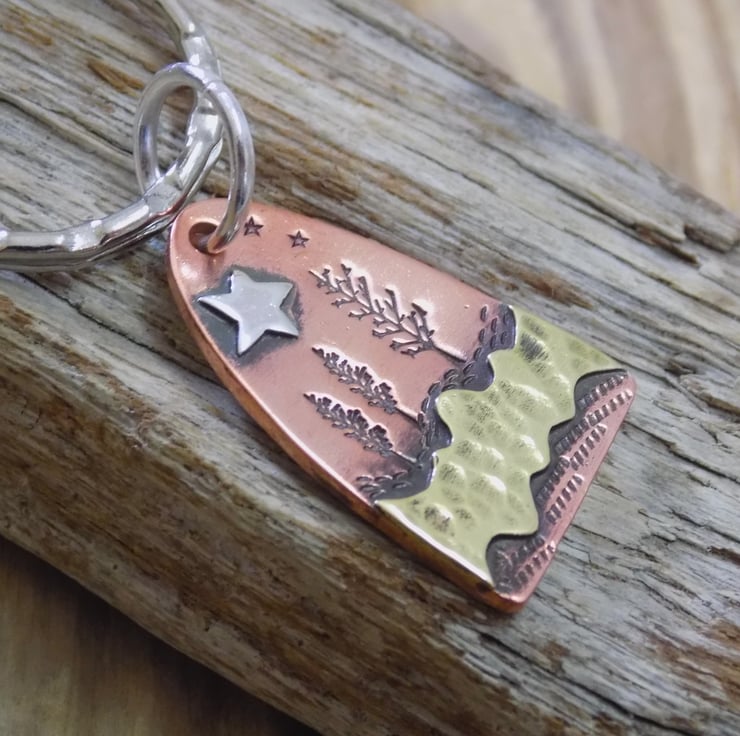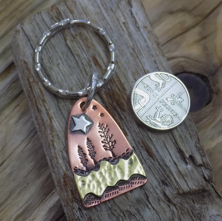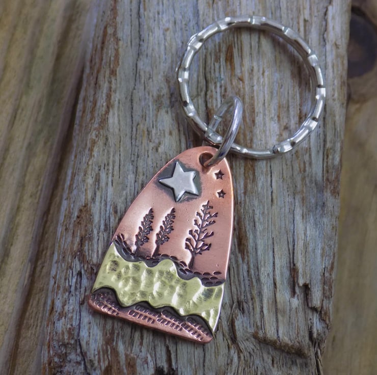 Made from 1.5 mm thick copper sheet, brass and sterling silver sheets. Based on my pendants but in keyring form. I've soldered on a brass mid ground which has been textured, then a few trees have been added above, a few stars plus a lovely sterling silver star to make it extra special!