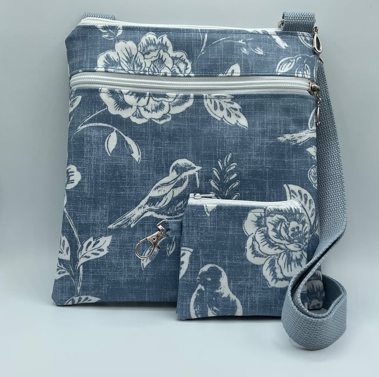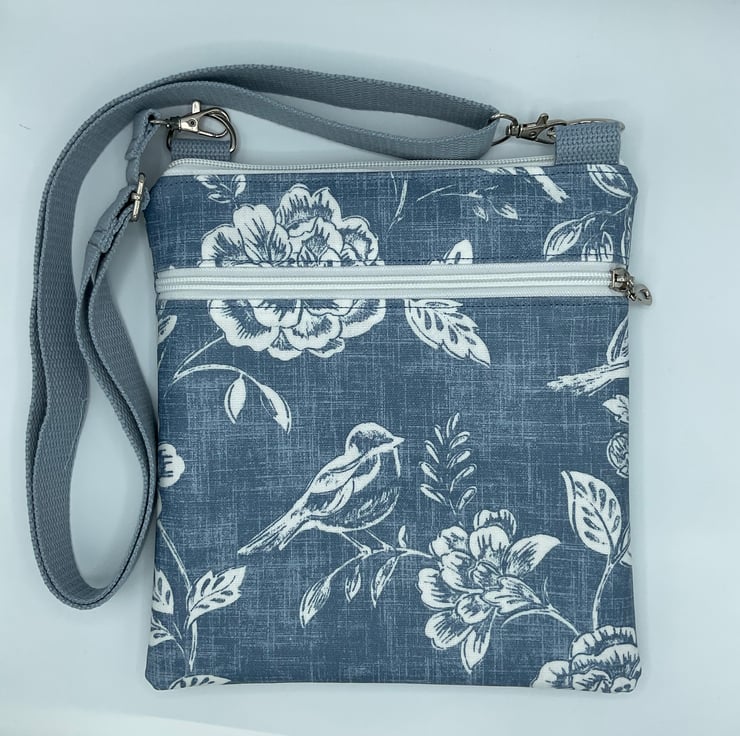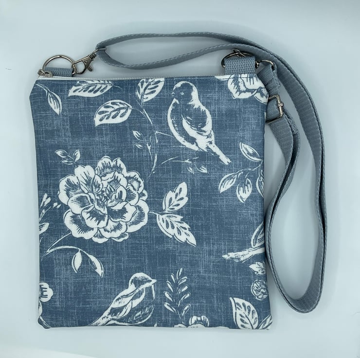 This crossbody bag has been made from oilcloth fabric, with a cotton denim chambray lining.