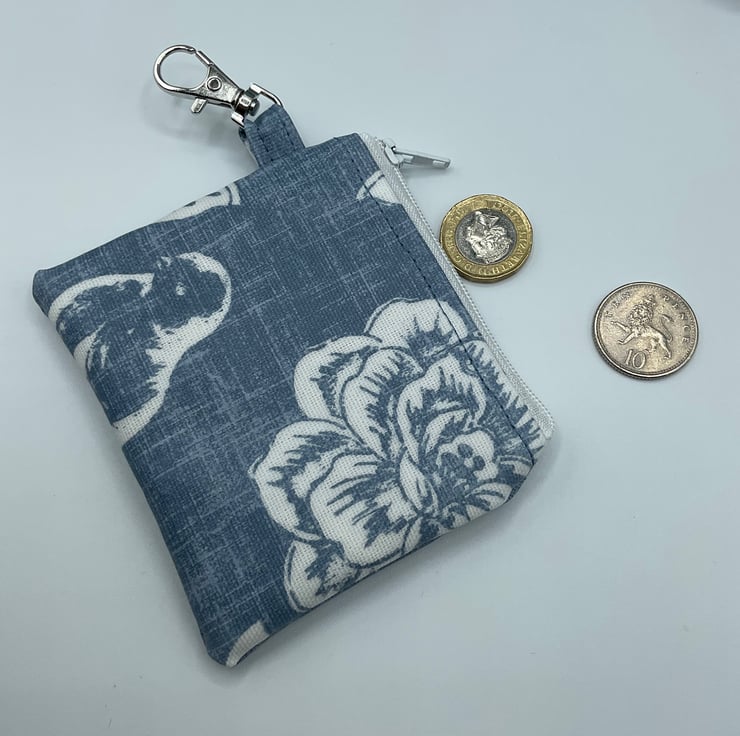 It has a zipped external pocket, a zipped internal pocket, a large internal slip pocket and a keychain clip. There's also a matching coin purse included.